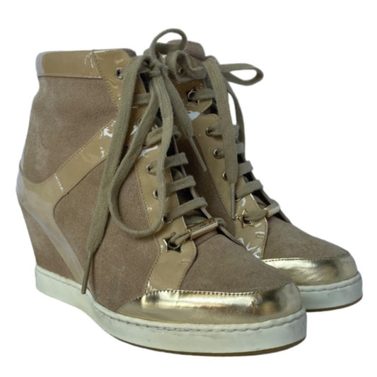 $795 JIMMY CHOO Panama Beige Suede & Patent Leather Wedge Sneakers, Size 36.5