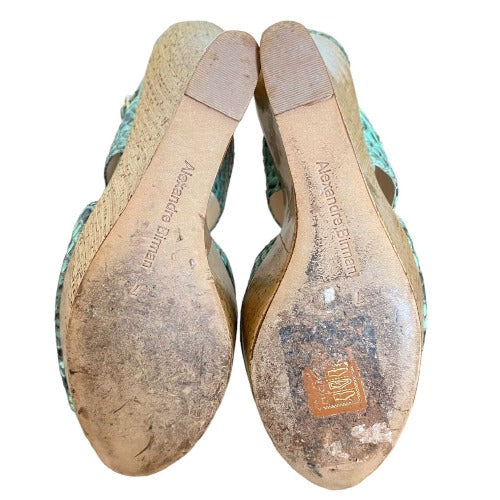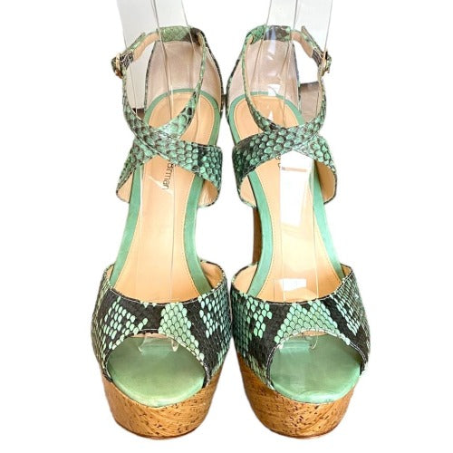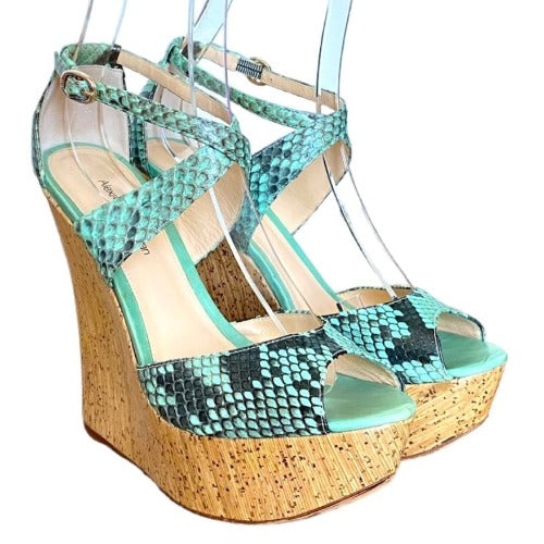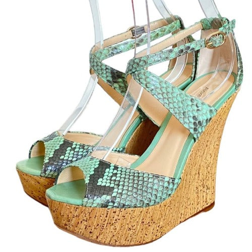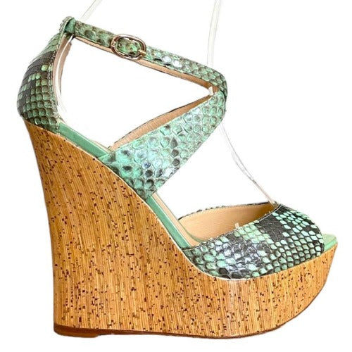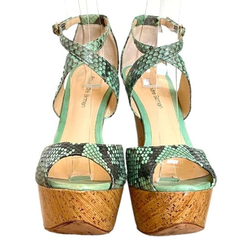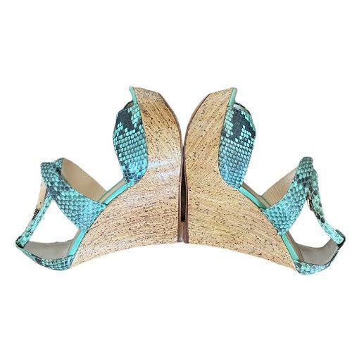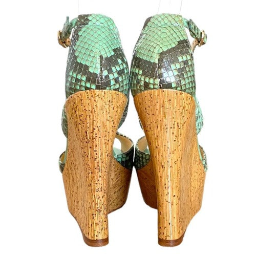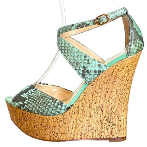 ALEXANDRE BIRMAN Green Python Leather Strappy Cork Wedge Sandals, Size 37