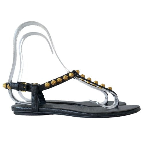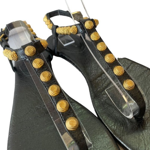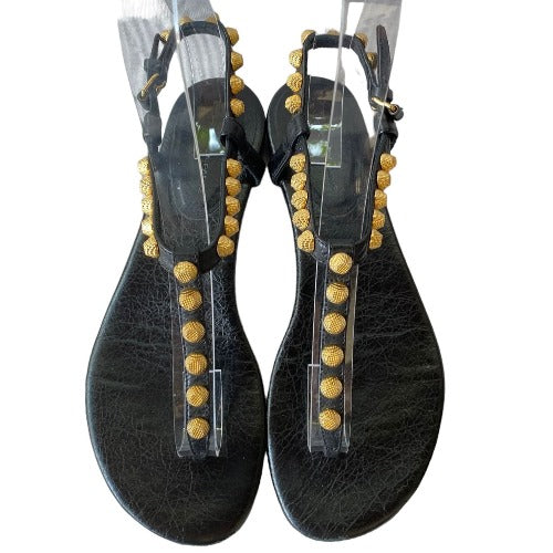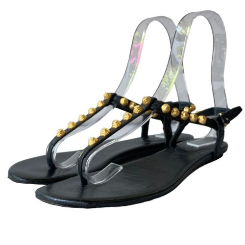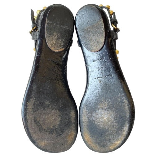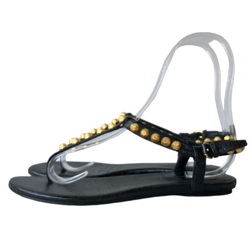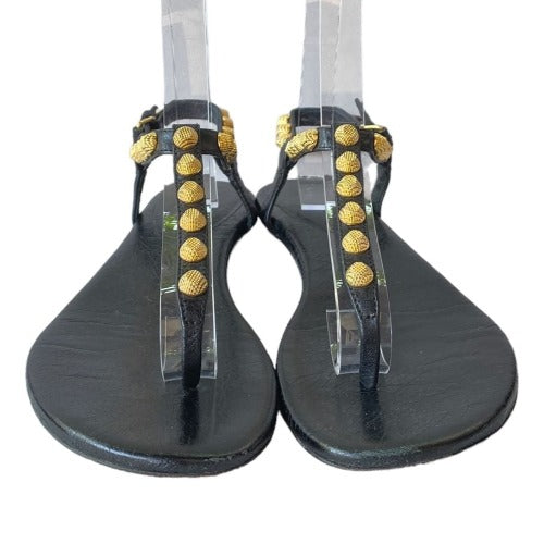 BALENCIAGA Black Leather Gold Studded Thong Flat Sandals, Size 37.5