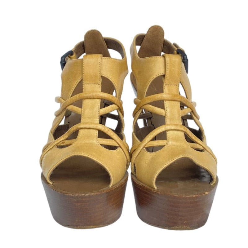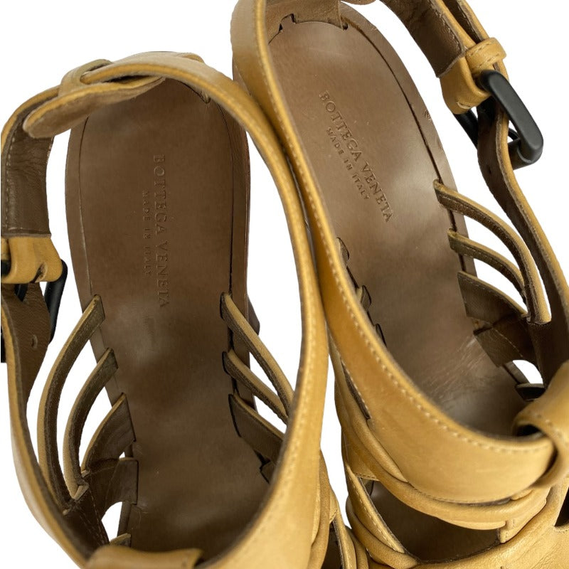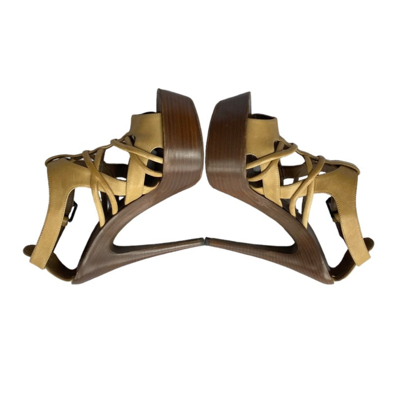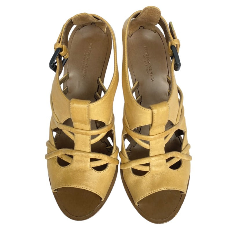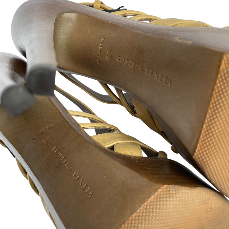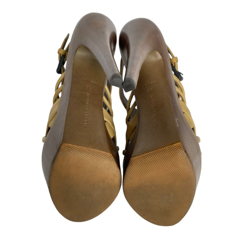 BOTTEGA VENETA Cream Leather Strappy ,Wooden Platform, Heel Sandals, Size 38