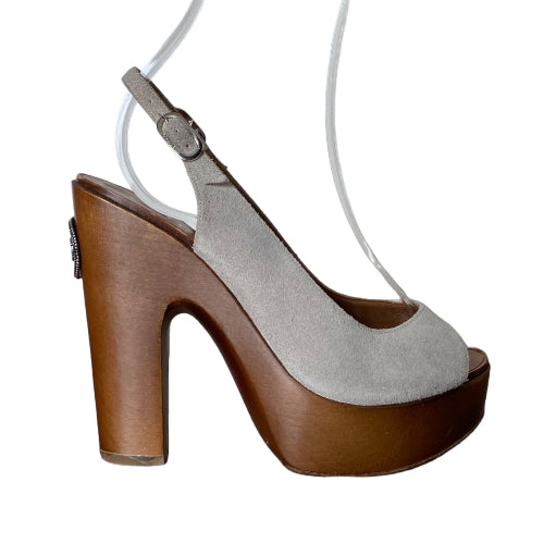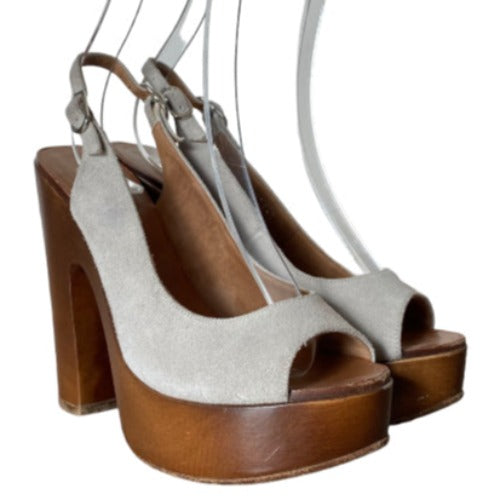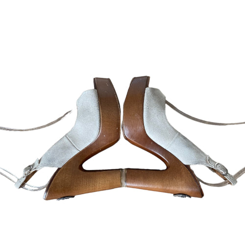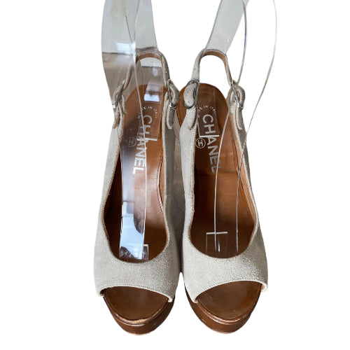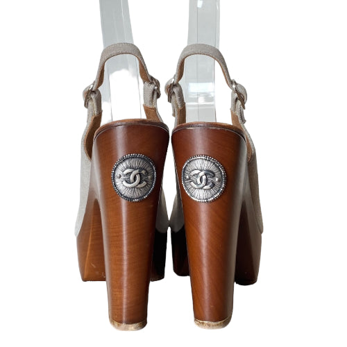 CHANEL Beige Suede Interlocking CC Logo Slingback Wooden Platform Sandals, 37