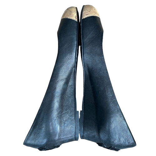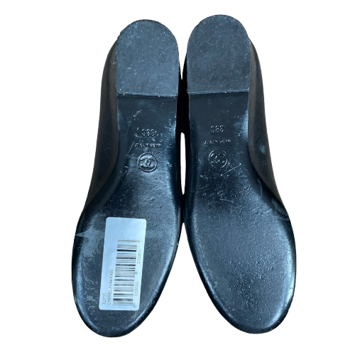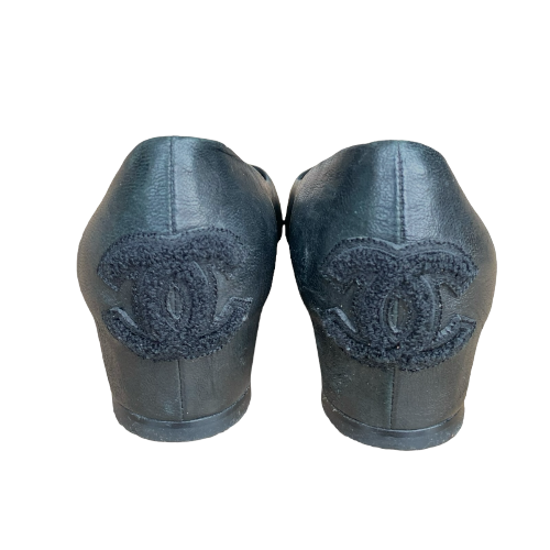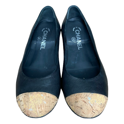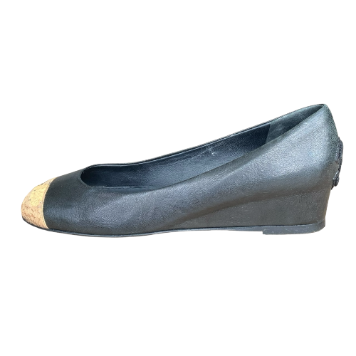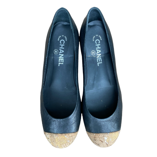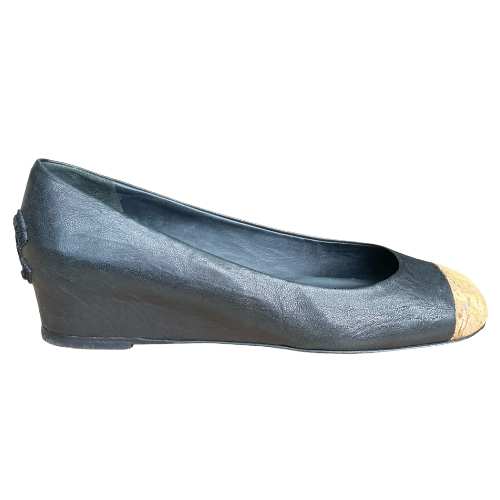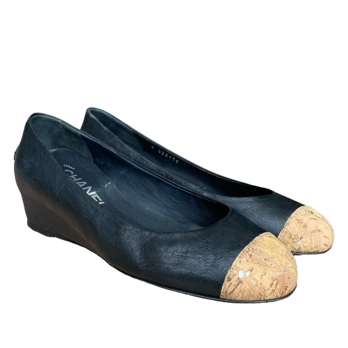 CHANEL Black Leather Cork Cap Toe Wedge Low Heel Pumps, Size 38