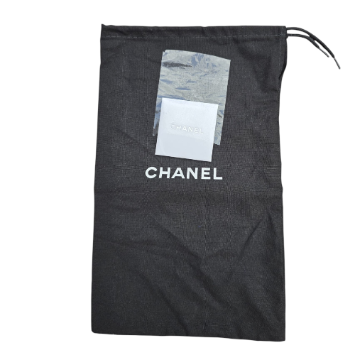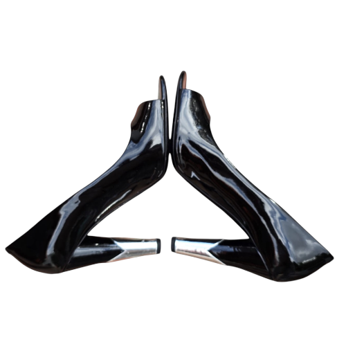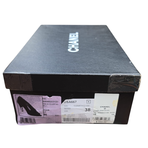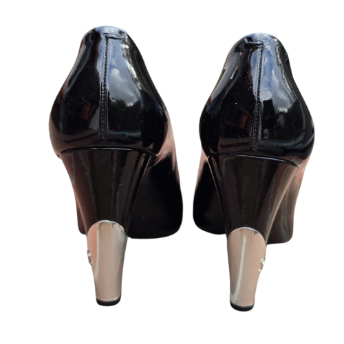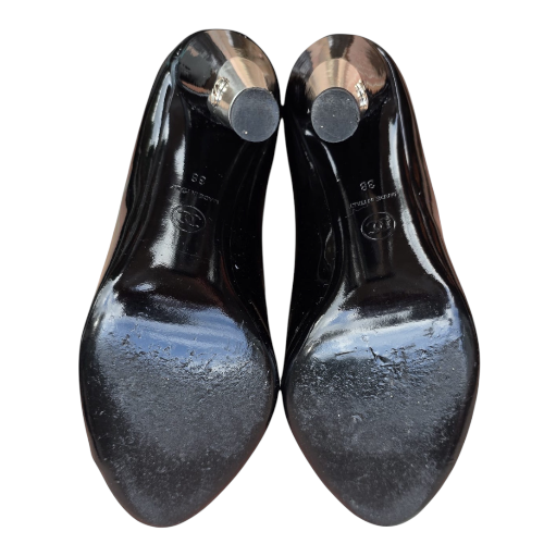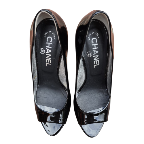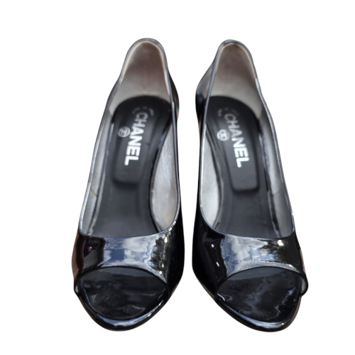 CHANEL Black Patent Leather Peep Toe CC Logo Silver Heel Pumps, Size 38