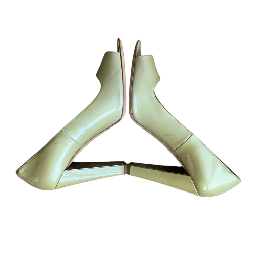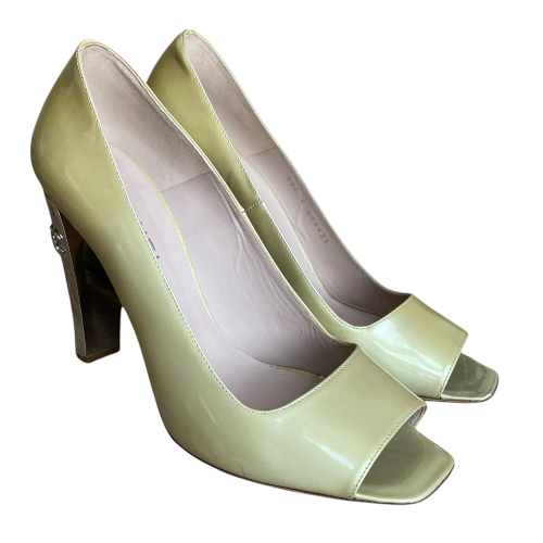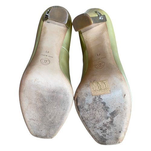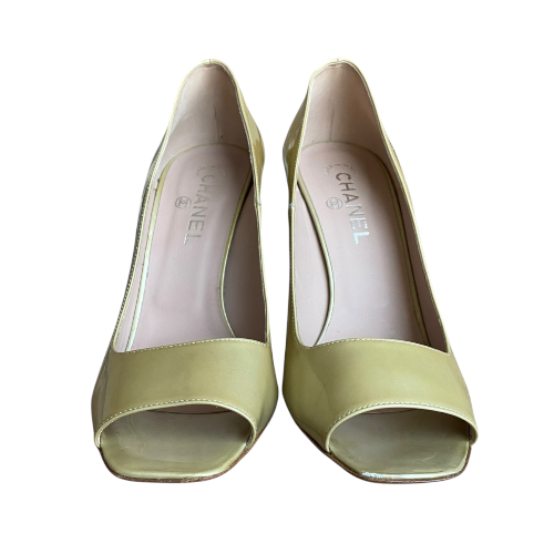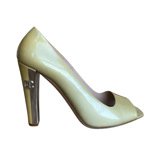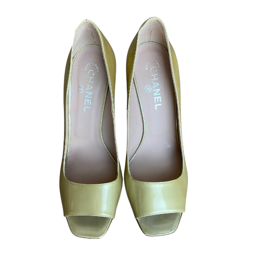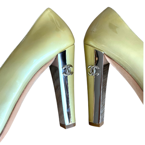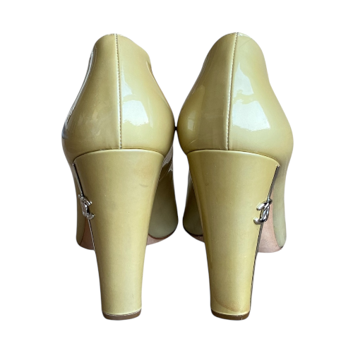 CHANEL Pale Yellow Patent Leather CC Logo Silver Heel Peep Toe Pumps, Size 41