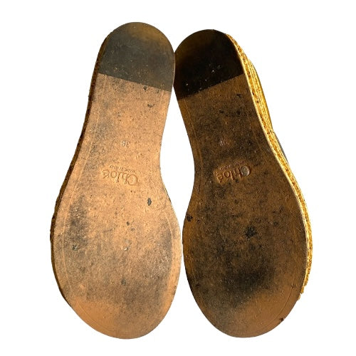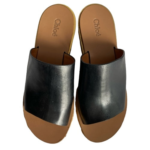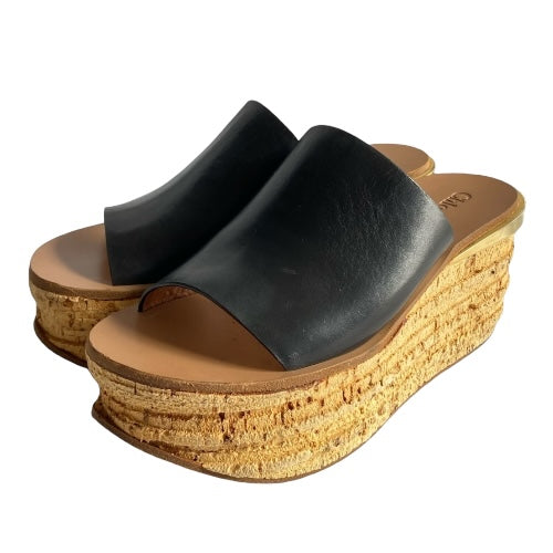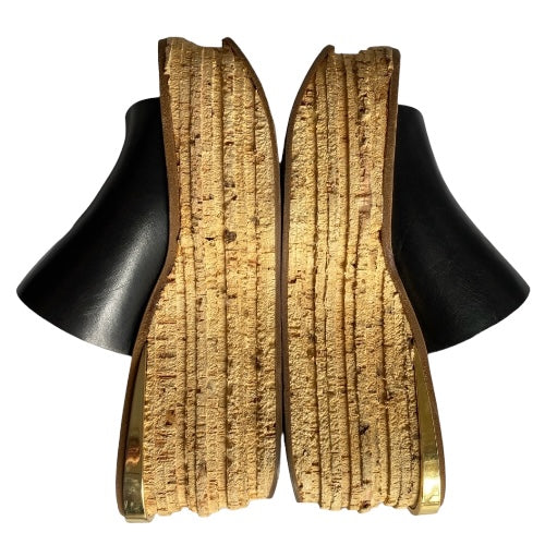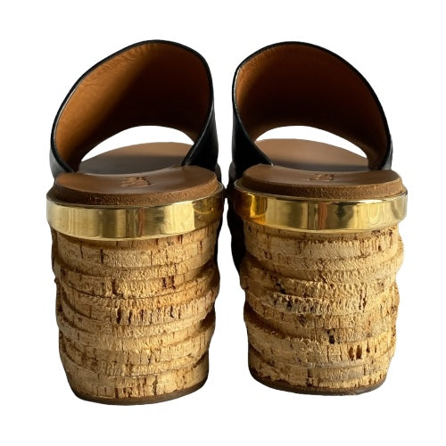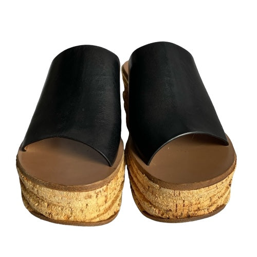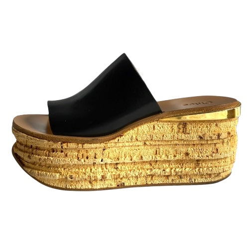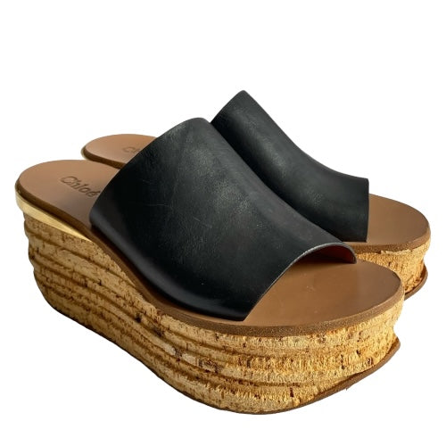 CHLOE Black Leather Cork Wedge Platform Slide Sandals, Size 38