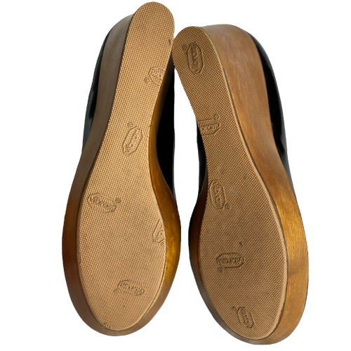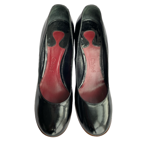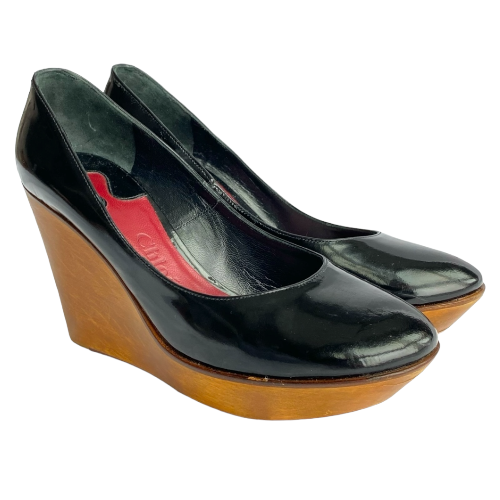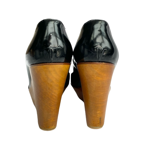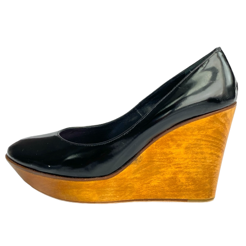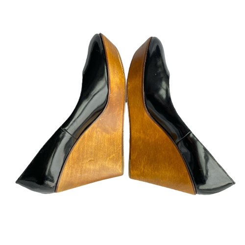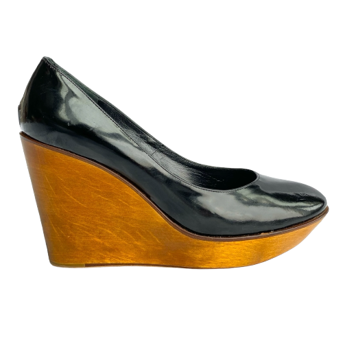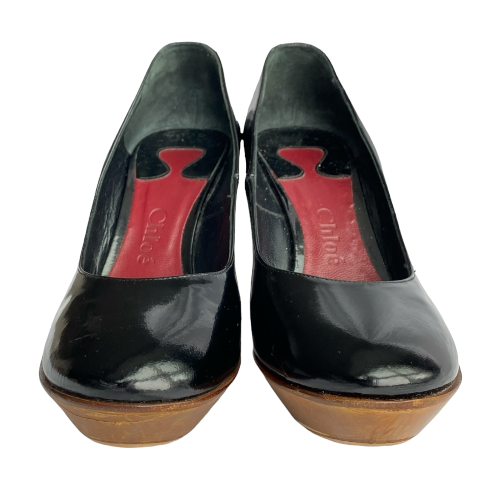 CHLOE Black Patent Leather Wooden Heel Wedge Pumps, Size 36