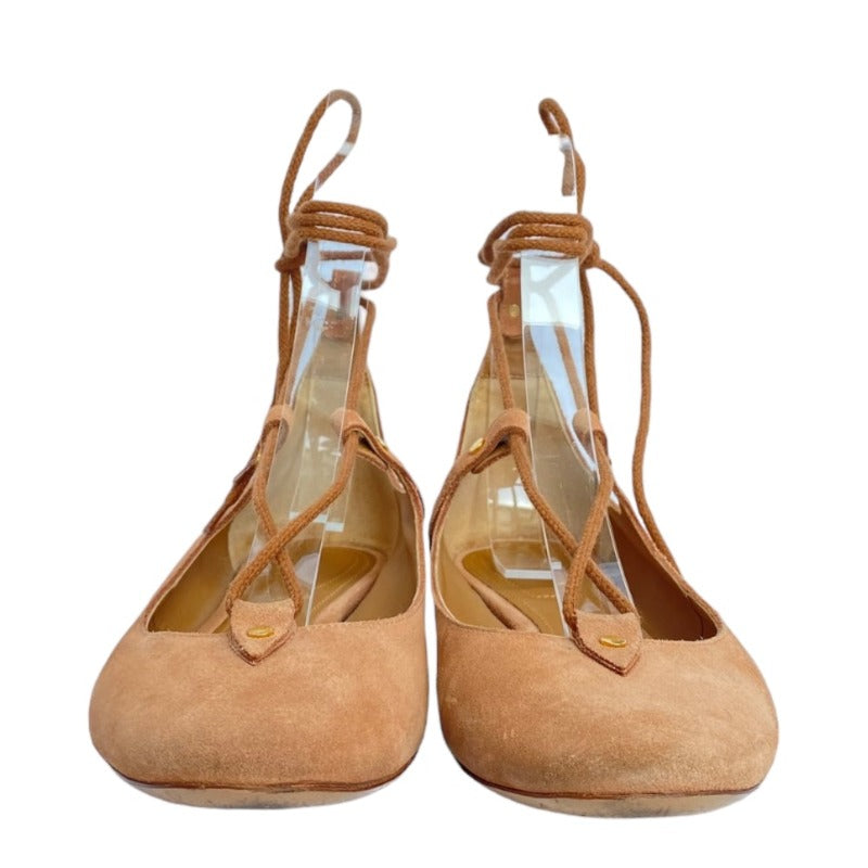 CHLOE Foster Camel Suede Lace-Up Ballerina Flat Ballet Shoes, Size 37.5