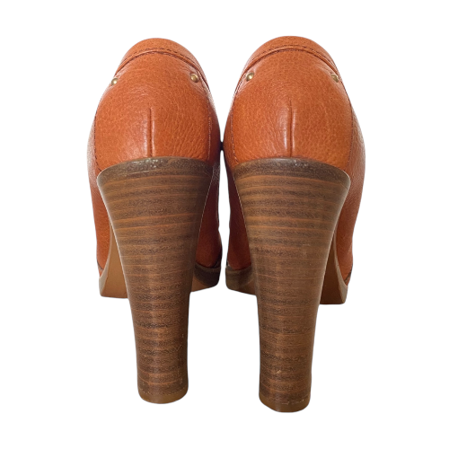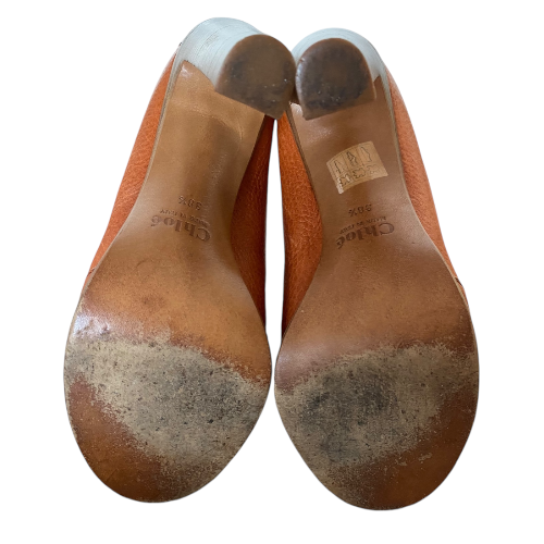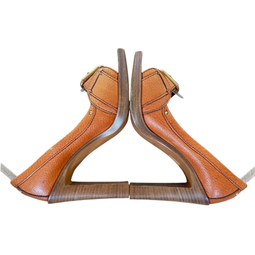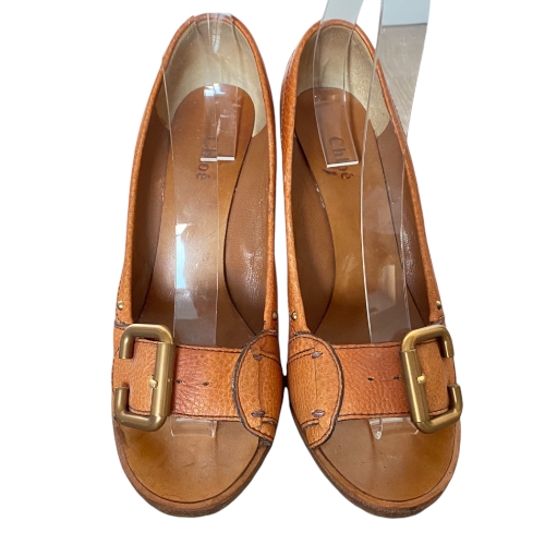 CHLOE Leather Buckle Detail Camel Peep Toe Pumps, Size 38.5