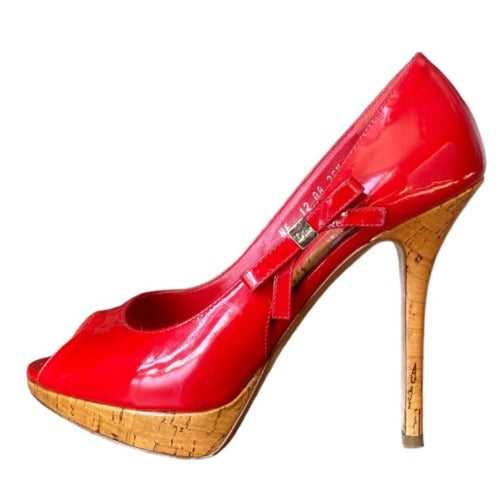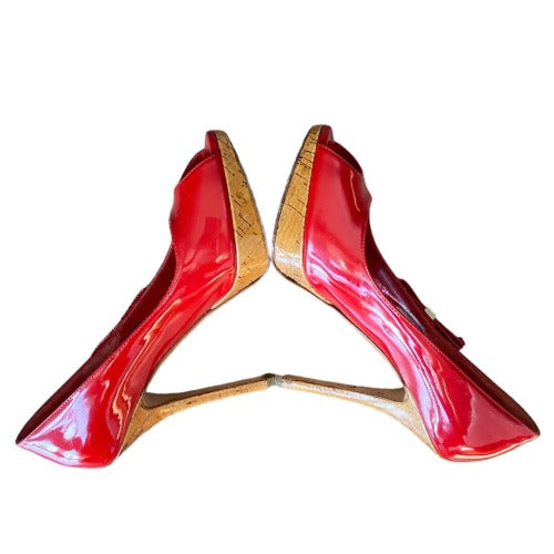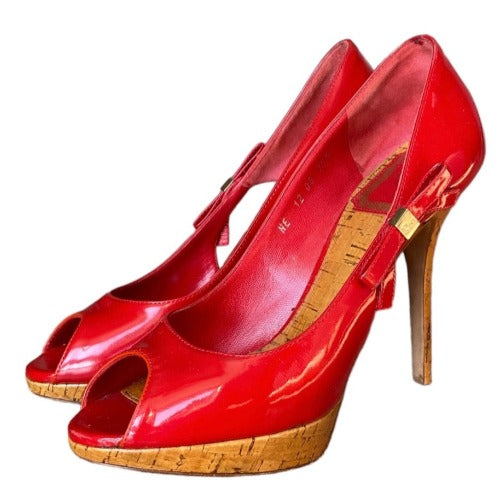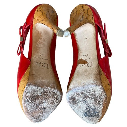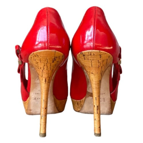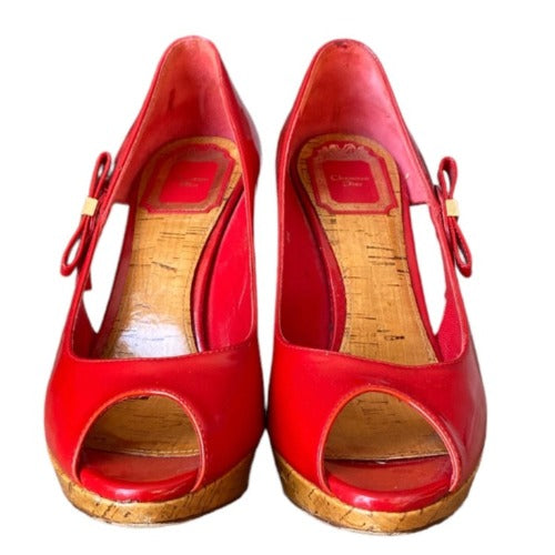 CHRISTIAN DIOR Red Patent Leather Bow Starlet Peep Toe Cork Heel Pumps Size 36.5