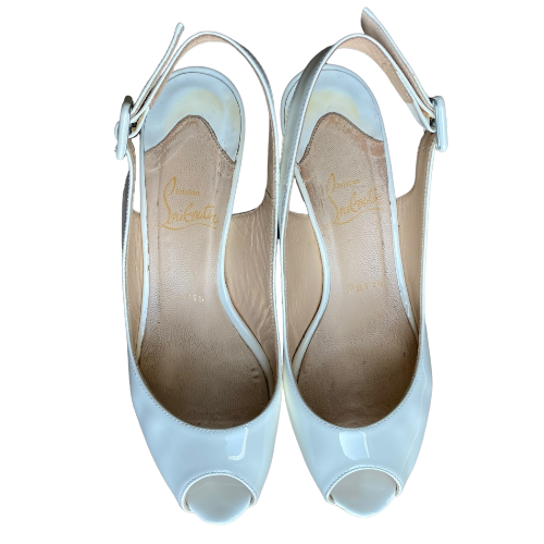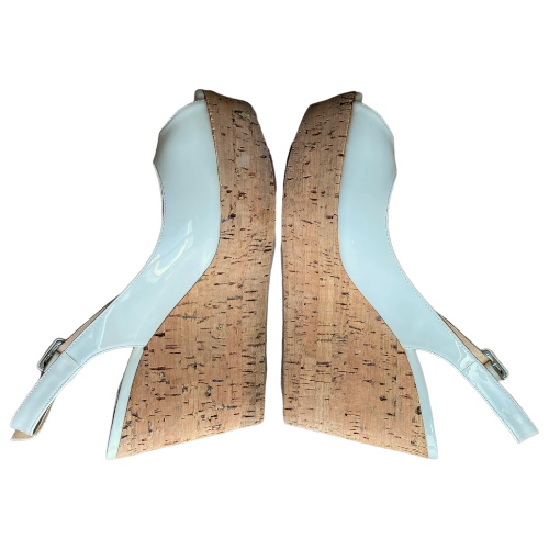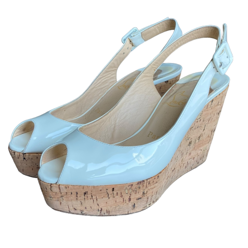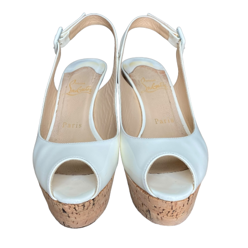 CHRISTIAN LOUBOUTIN Off White Patent Leather Une Plume Cork Wedge Sandals, 36.5