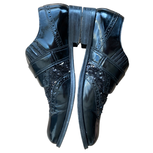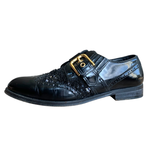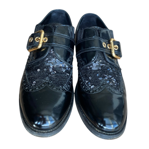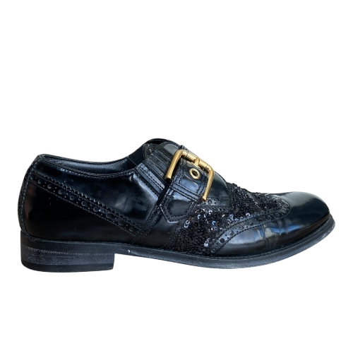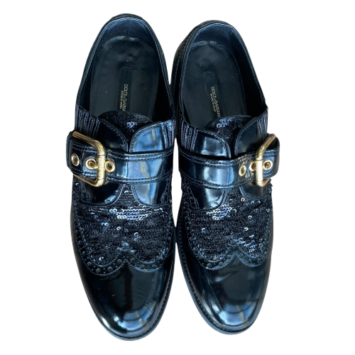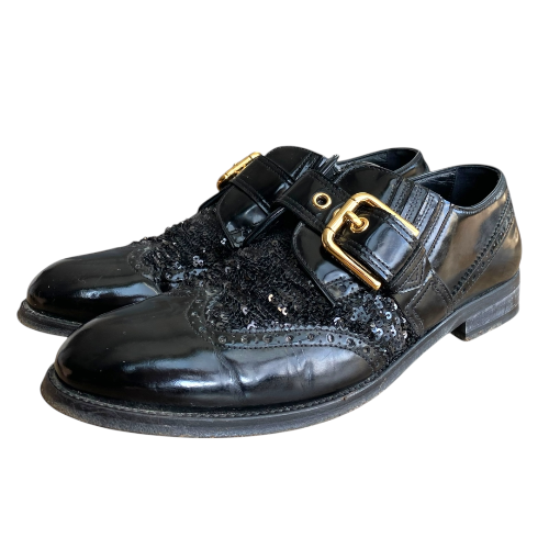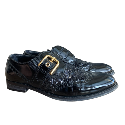 DOLCE & GABBANA Black Brogue Patent Leather Sequin Embellished Oxfords, Size 39