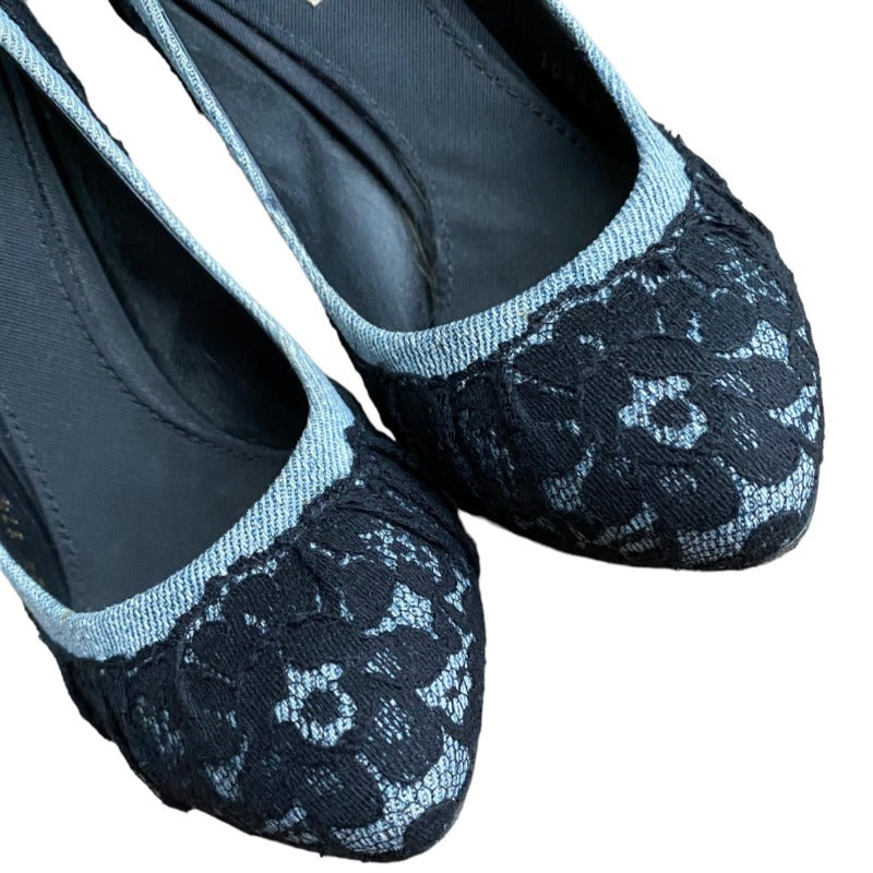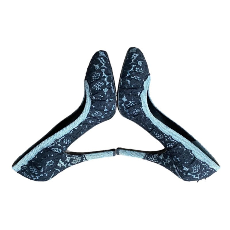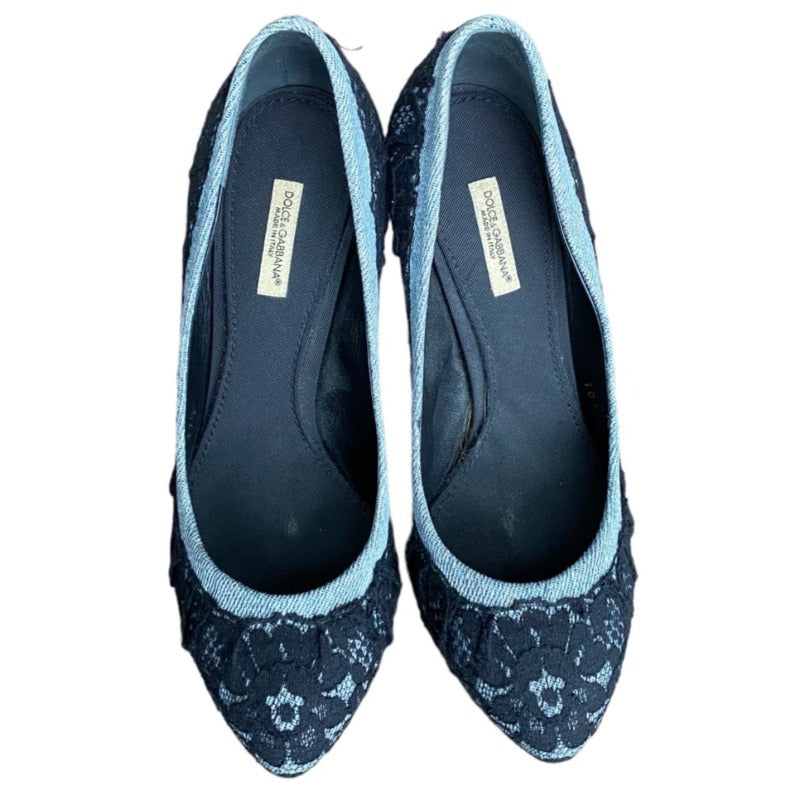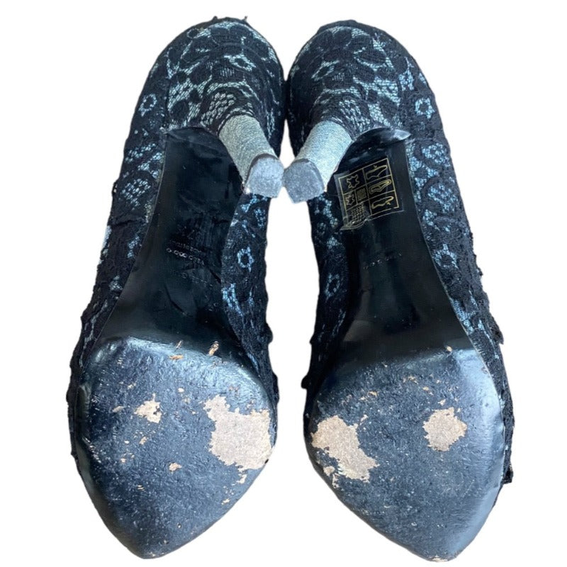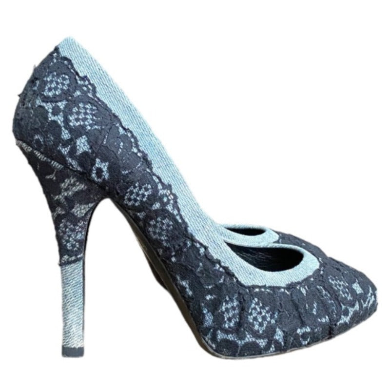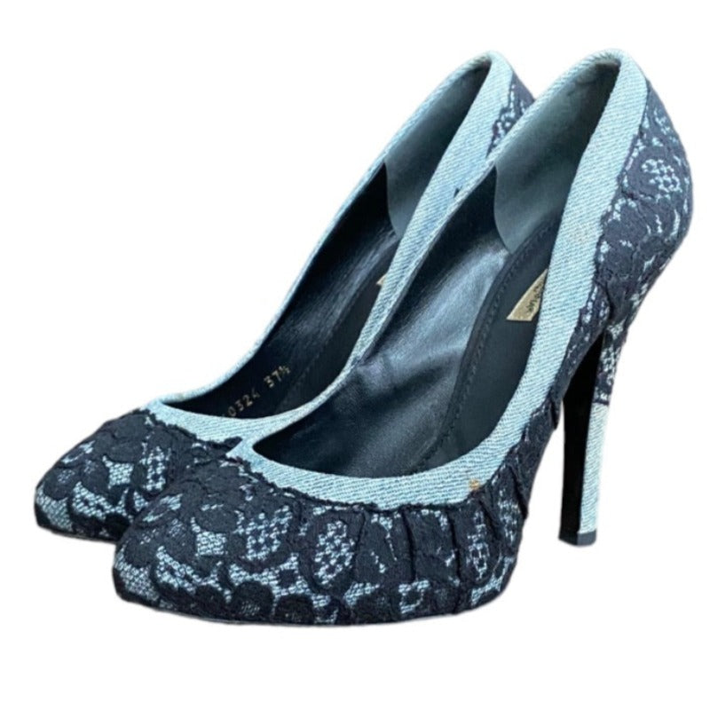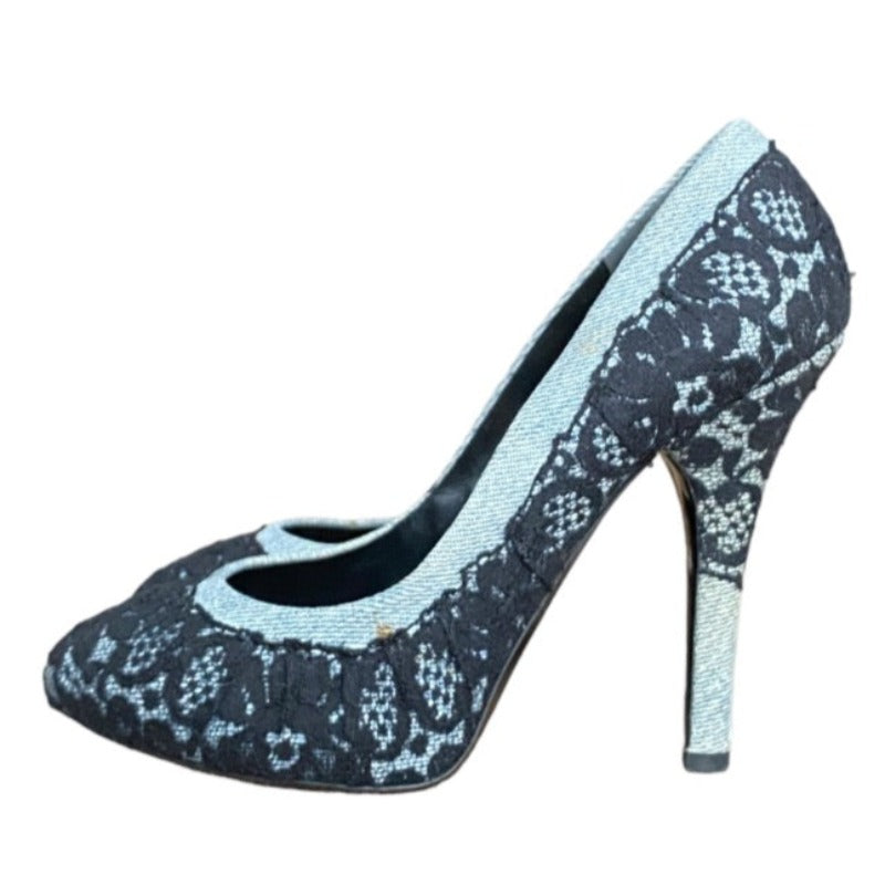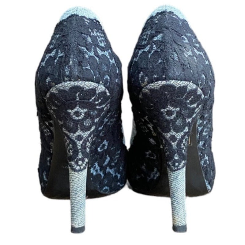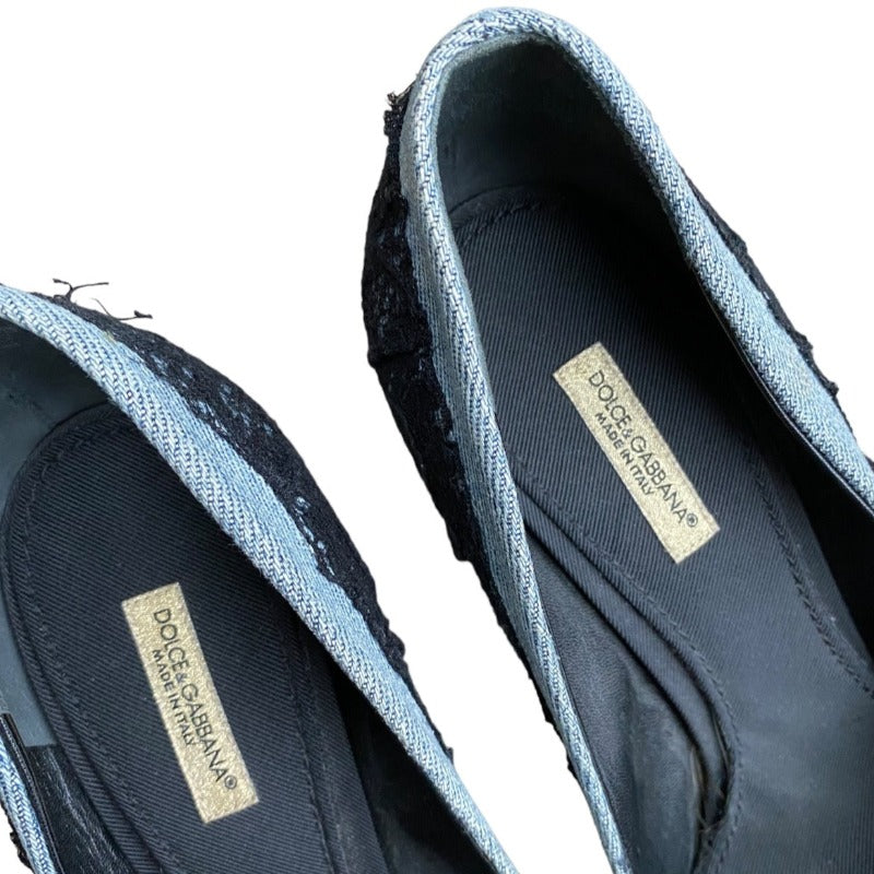 DOLCE & GABBANA Black/Light Blue Lace and Denim Hidden Platform Pumps, Size 37.5