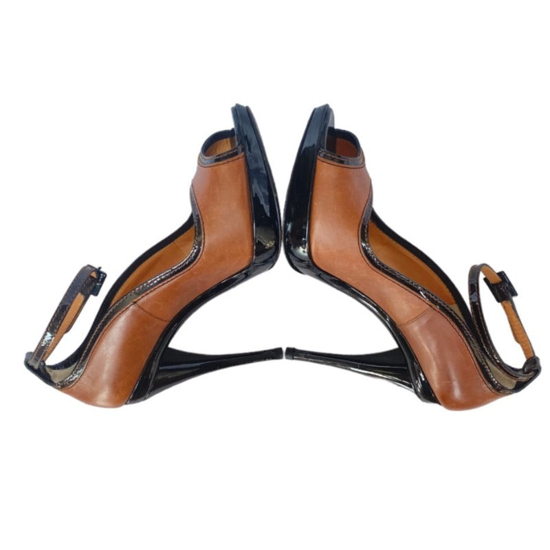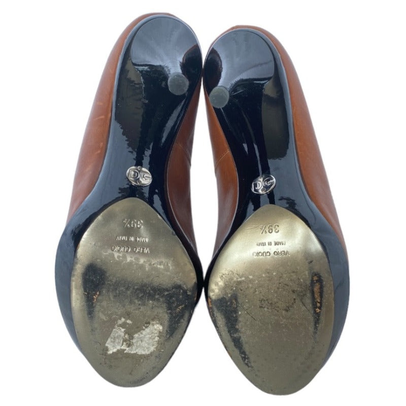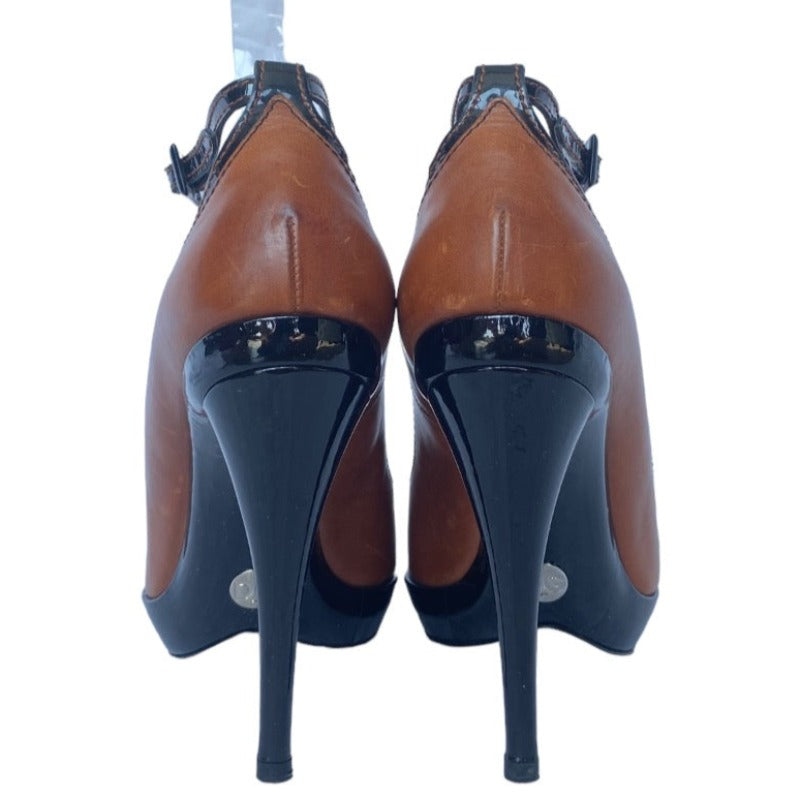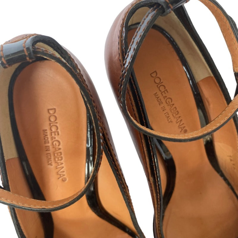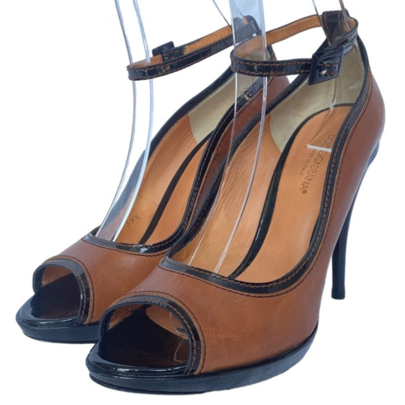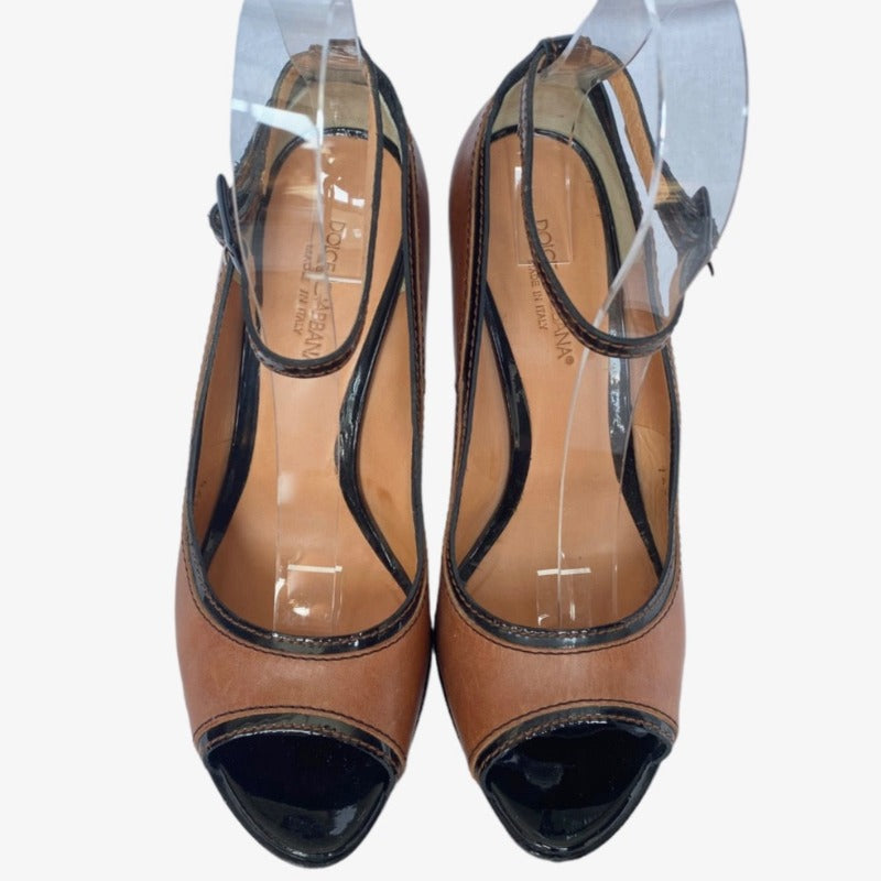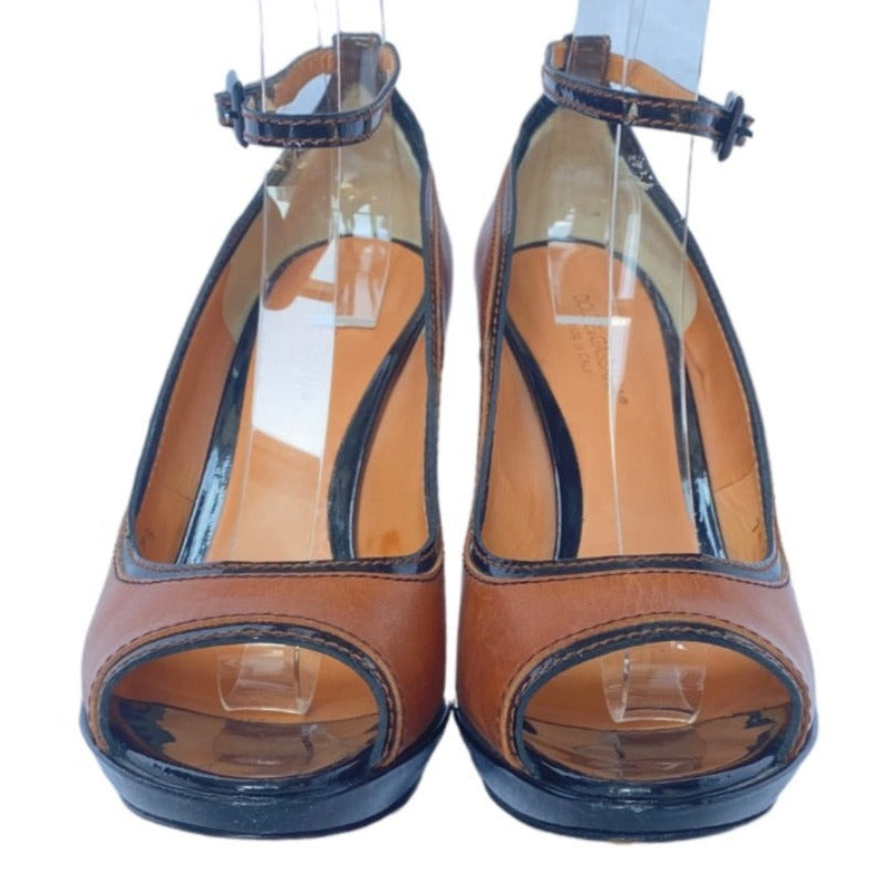 DOLCE & GABBANA Brown/Black Patent & Leather Peep Toe Ankle Strap Pumps, Size 39.5