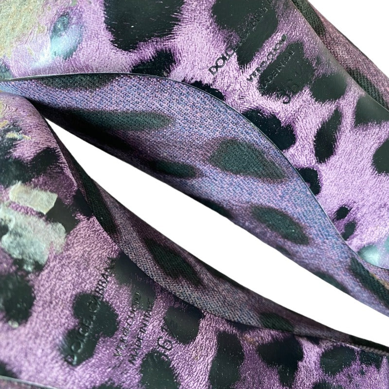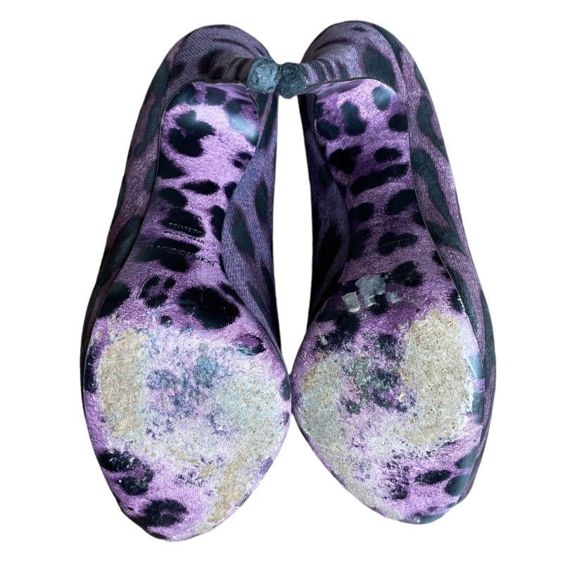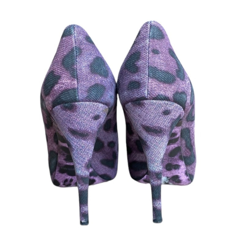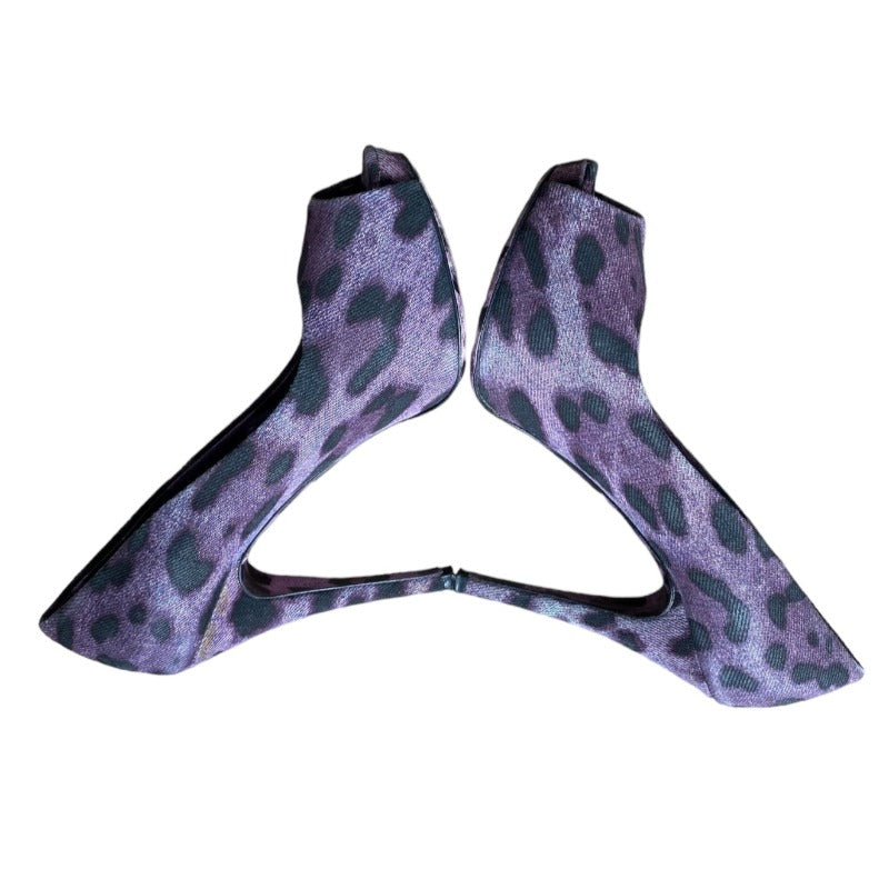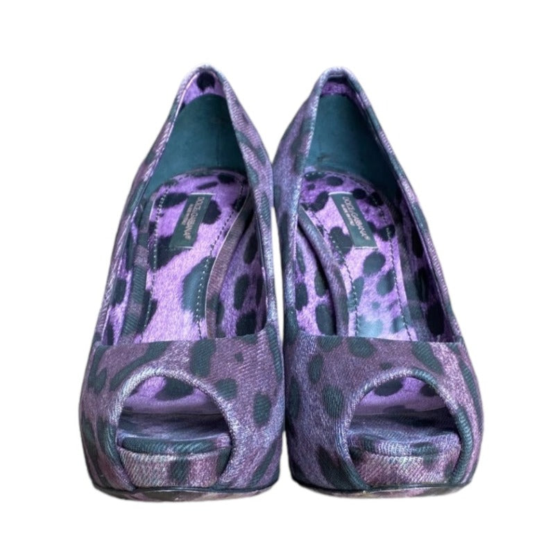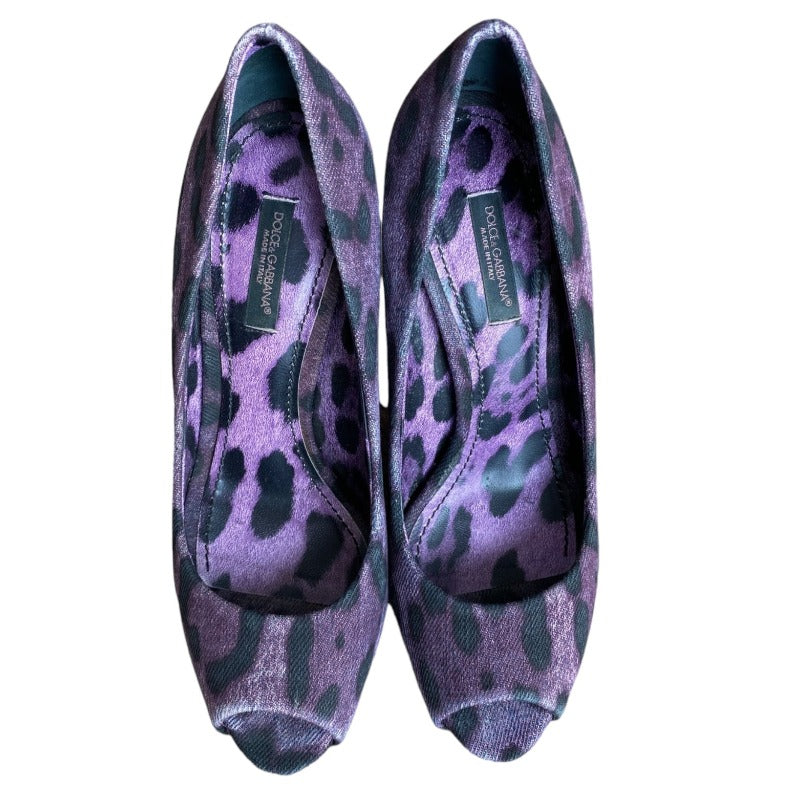 DOLCE & GABBANA Purple/Black Leopard Print Denim Peep Toe Pumps, Size 36.5