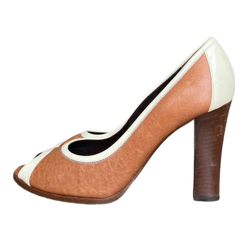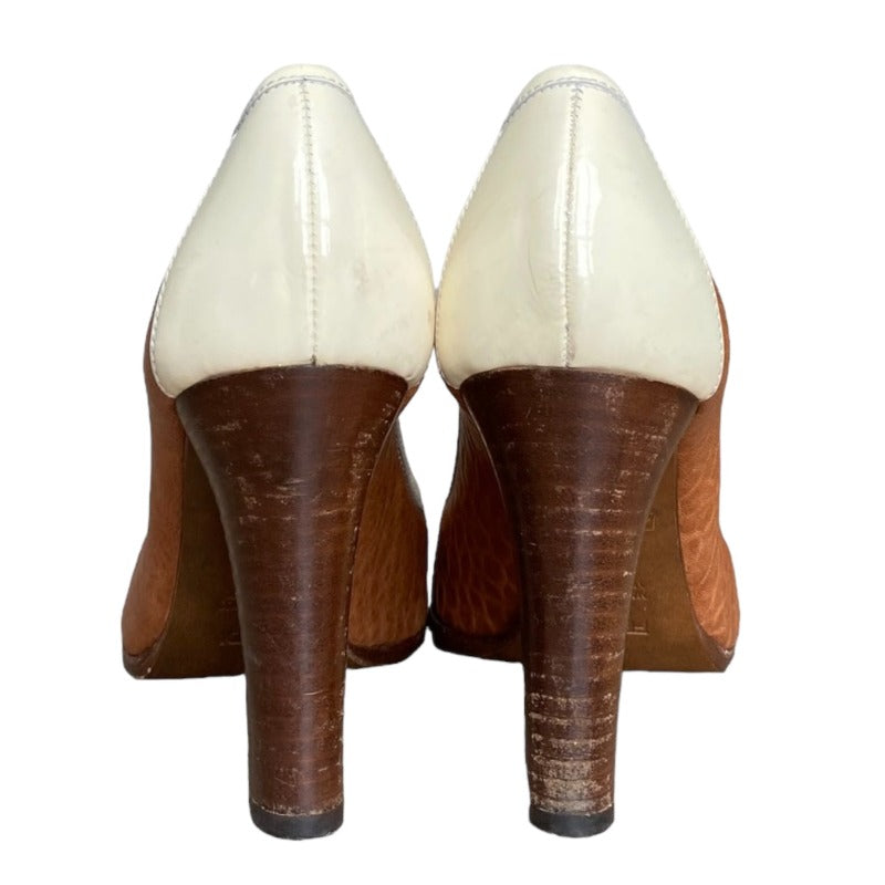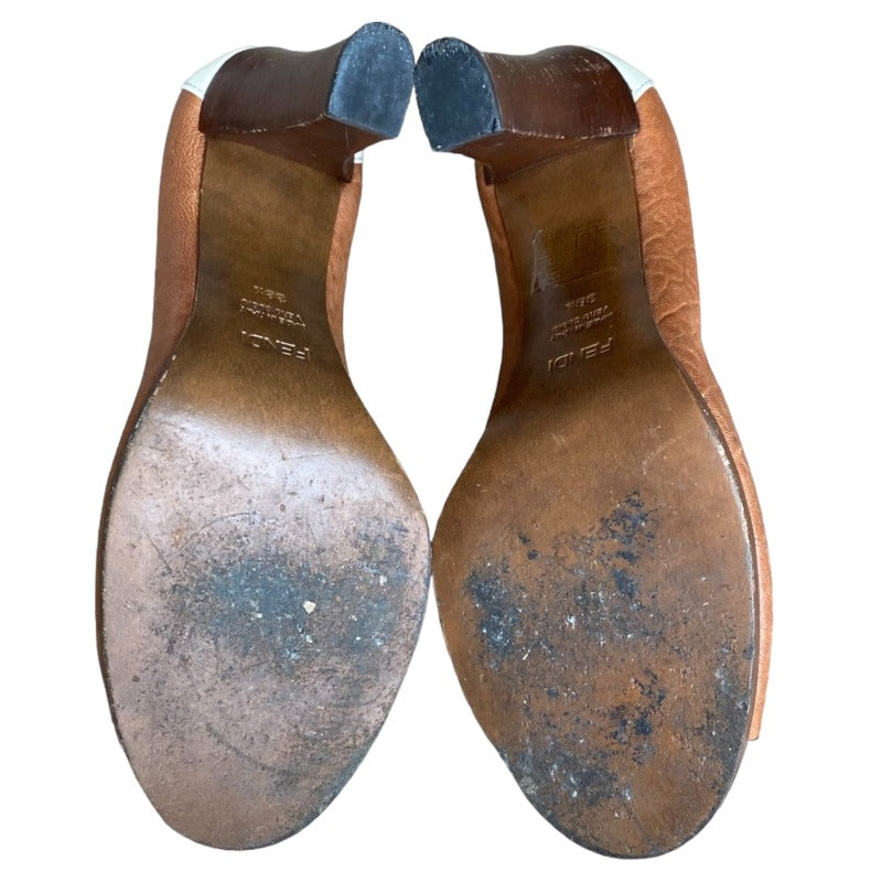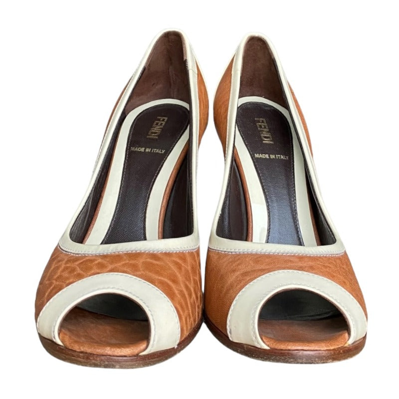 FENDI Brown Leather, Ivory Patent Leather Peep Toe Block Heels Pumps, Size 38.5
