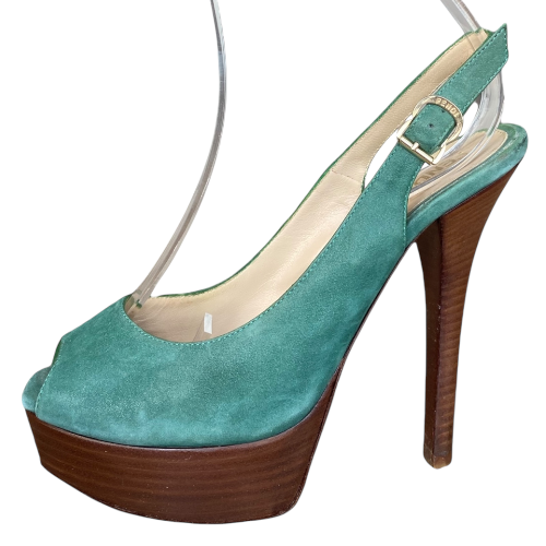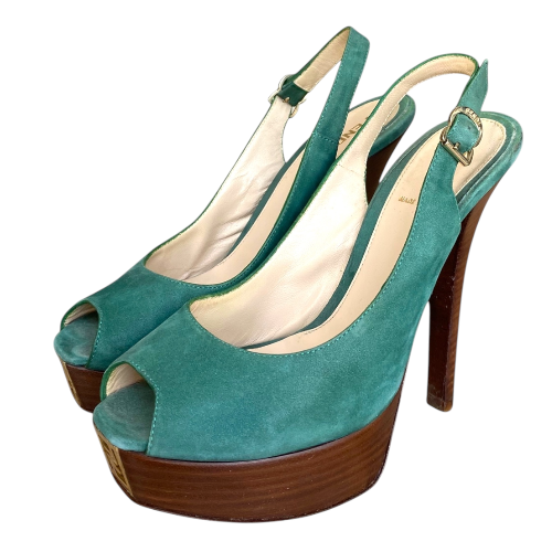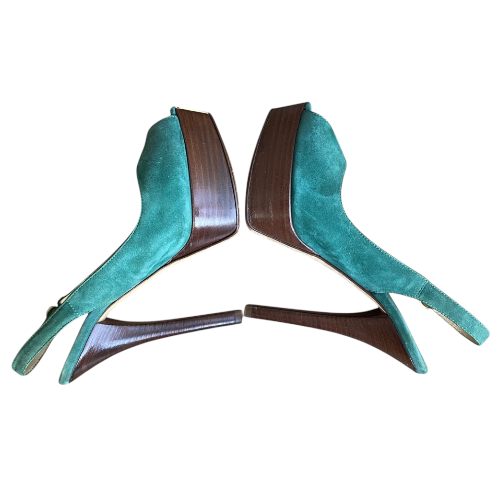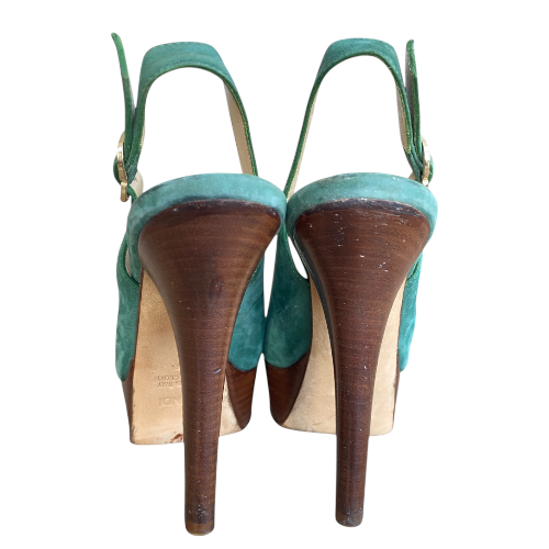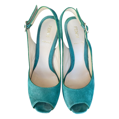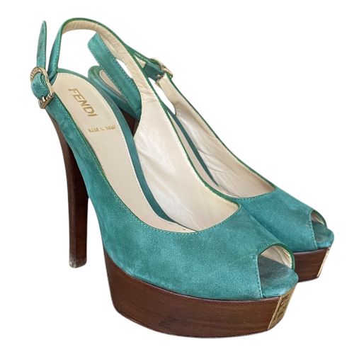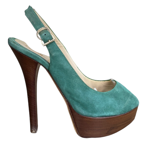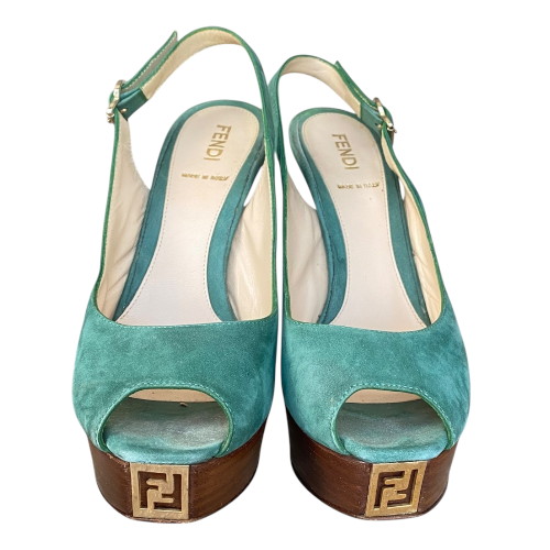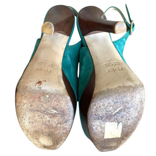 FENDI Fendista Green Suede Slingback Peep Toe Platform Pumps, Size 36