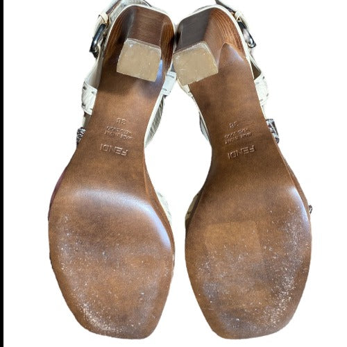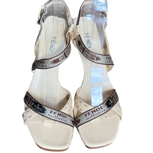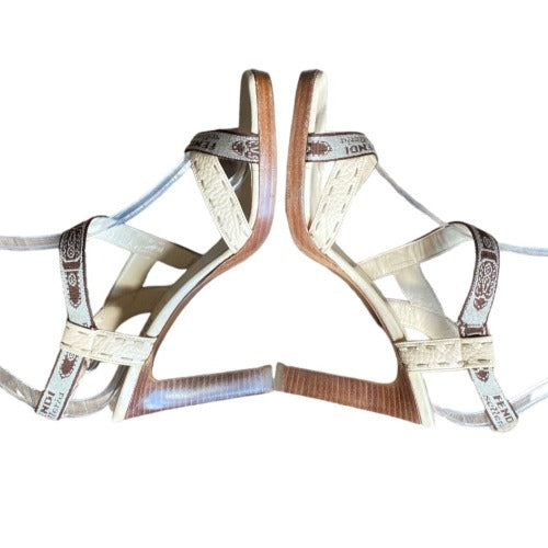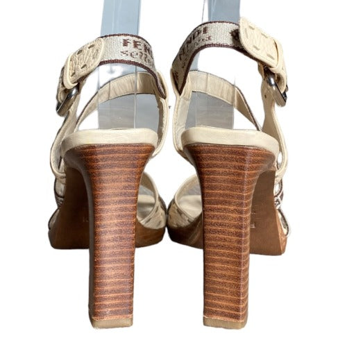 FENDI Selleria Beige Leather, Canvas Criss Cross Strappy Heeled Sandals, Size 38