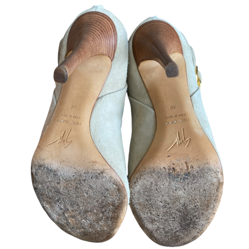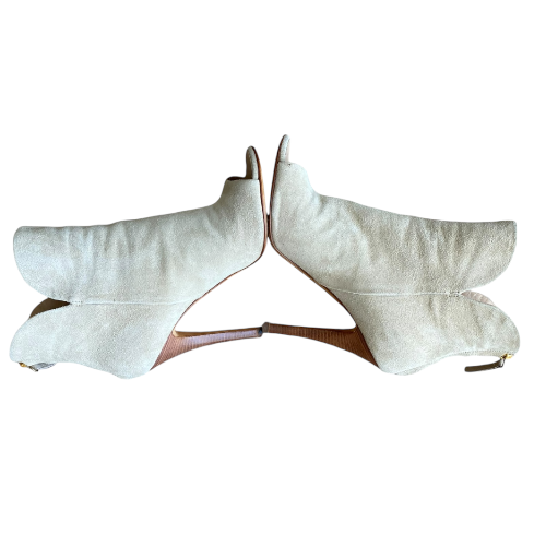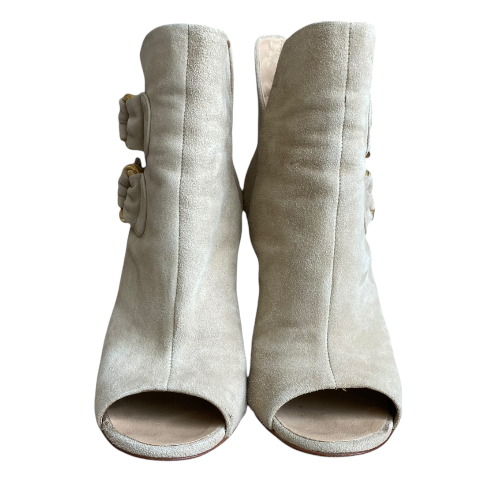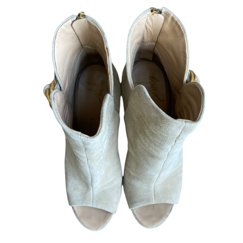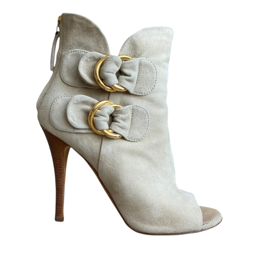 GIUSEPPE ZANOTTI Beige Suede Gold Buckle Detail Peep Toe Ankle Boots, Size 36