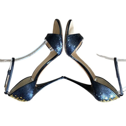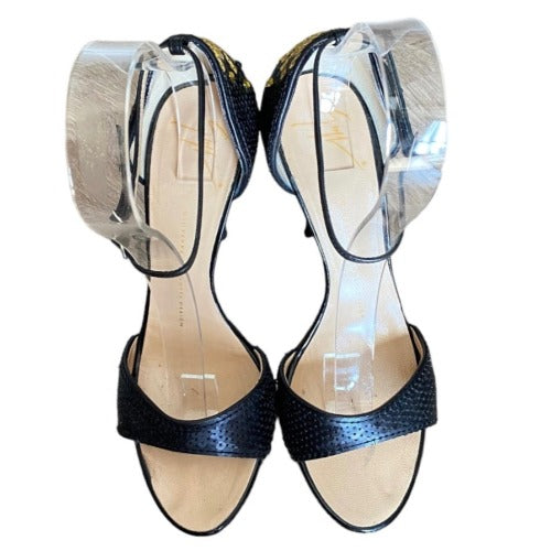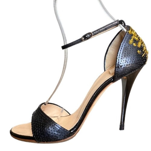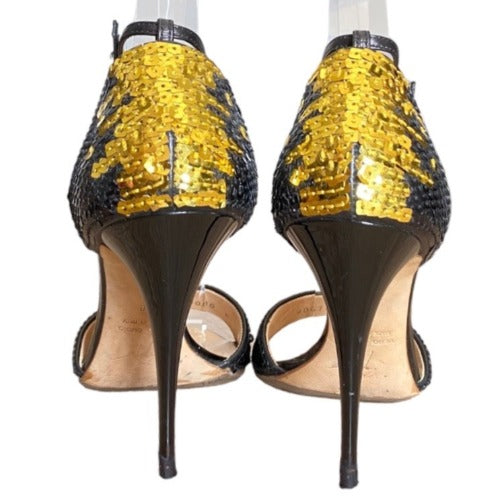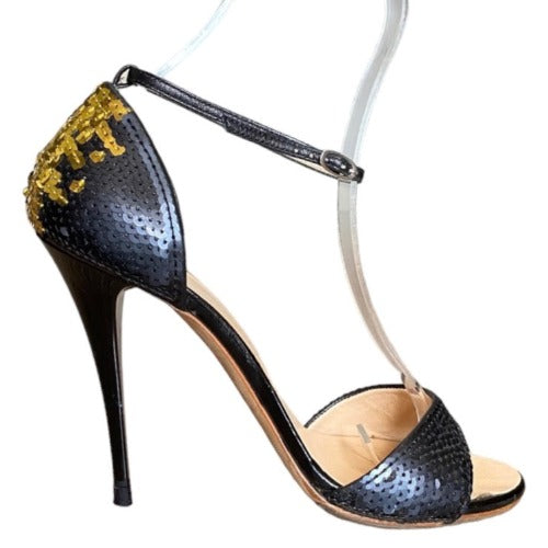 GIUSEPPE ZANOTTI Black & Gold Sequin Open Toe Ankle Strap Heeled Sandal, Size 38
