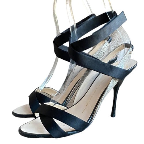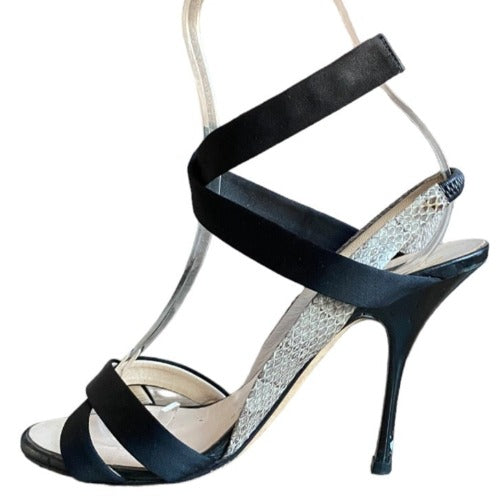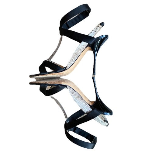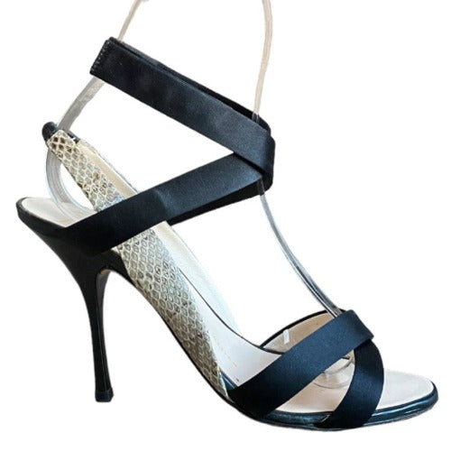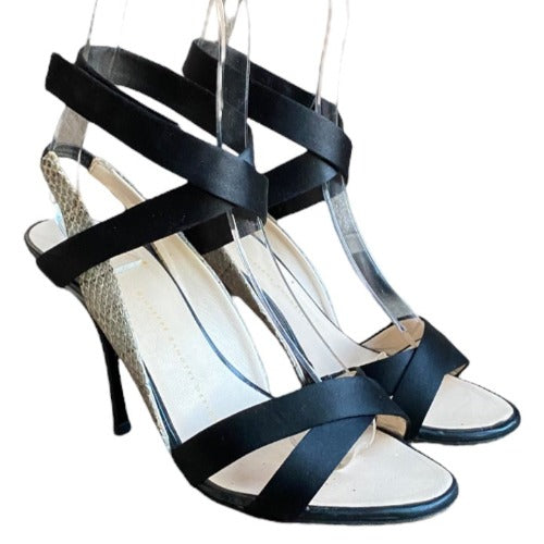 GIUSEPPE ZANOTTI Black Satin & Beige Python Leather Strappy Sandals, Size 37.5