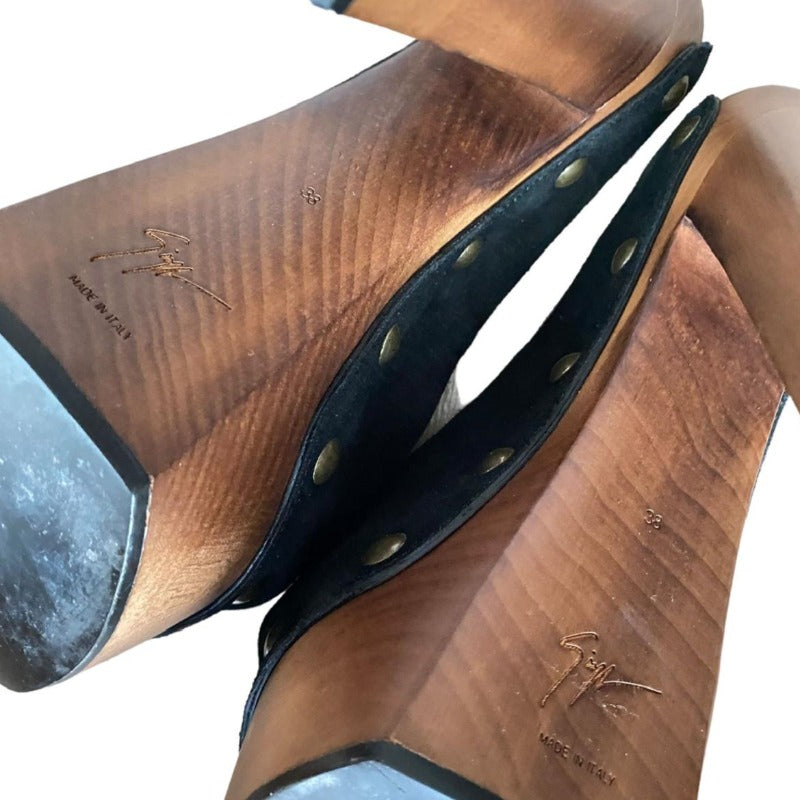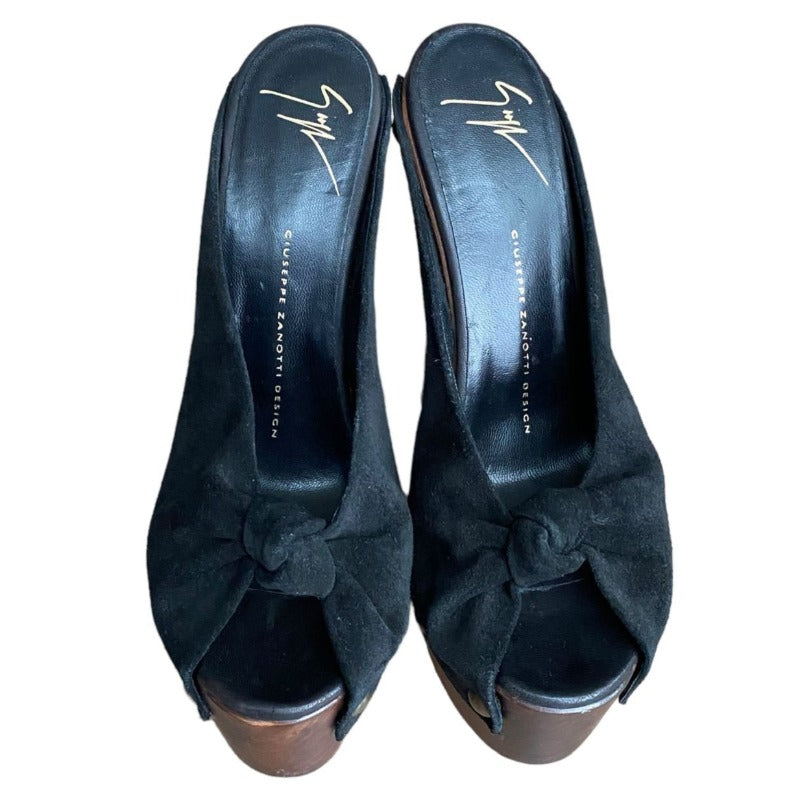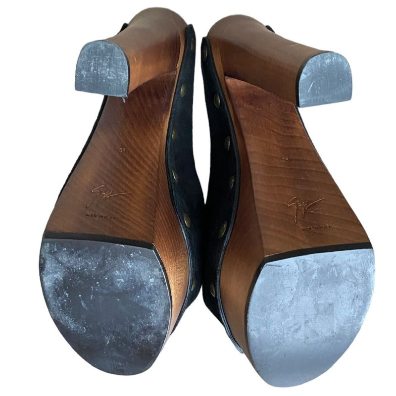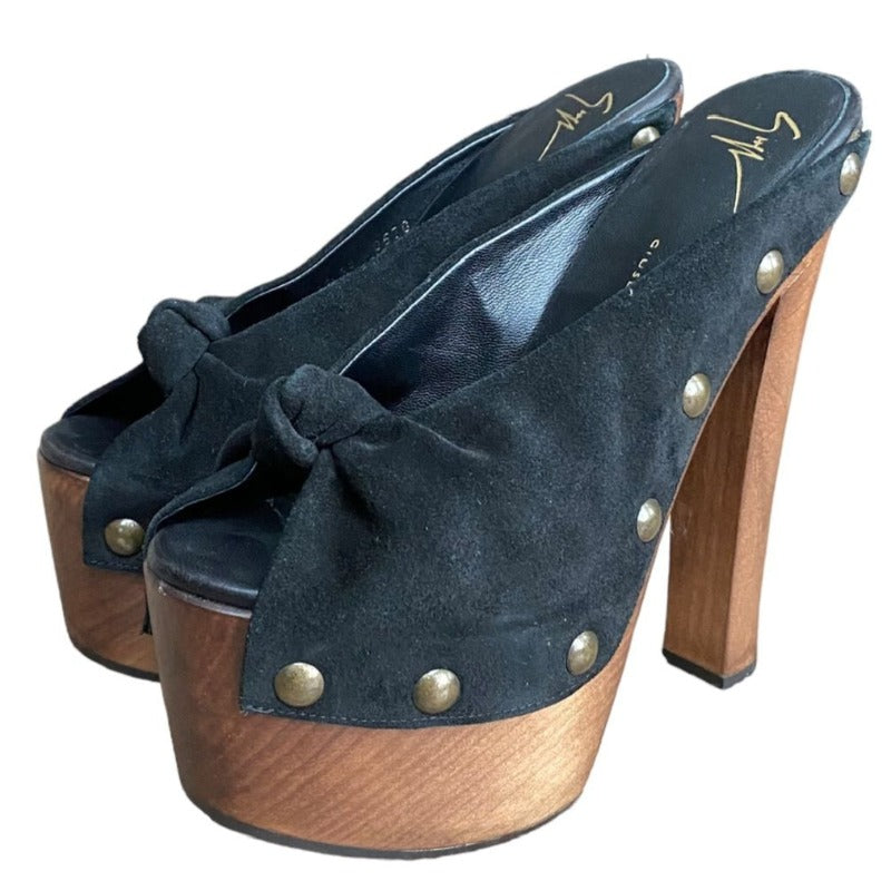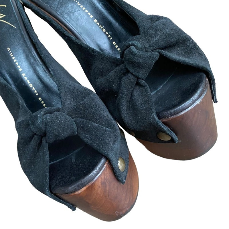 GIUSEPPE ZANOTTI Black Suede Knot Studded Wooden Heels Platform Clogs, Size 38