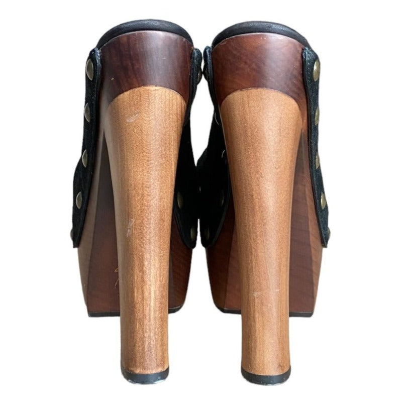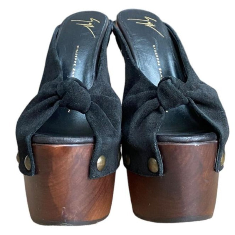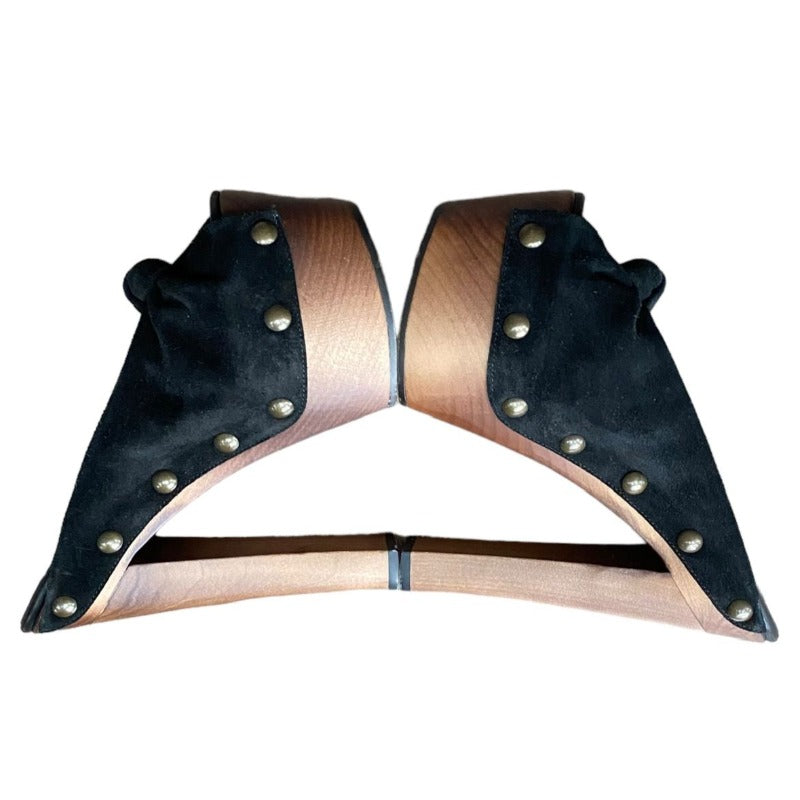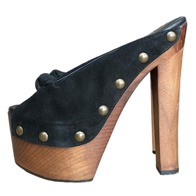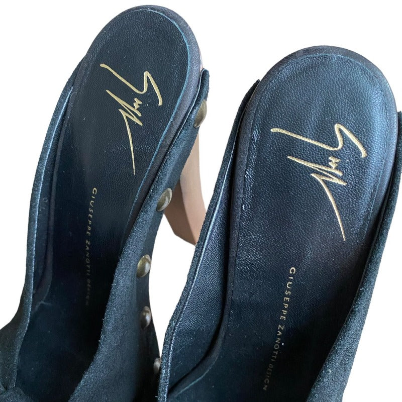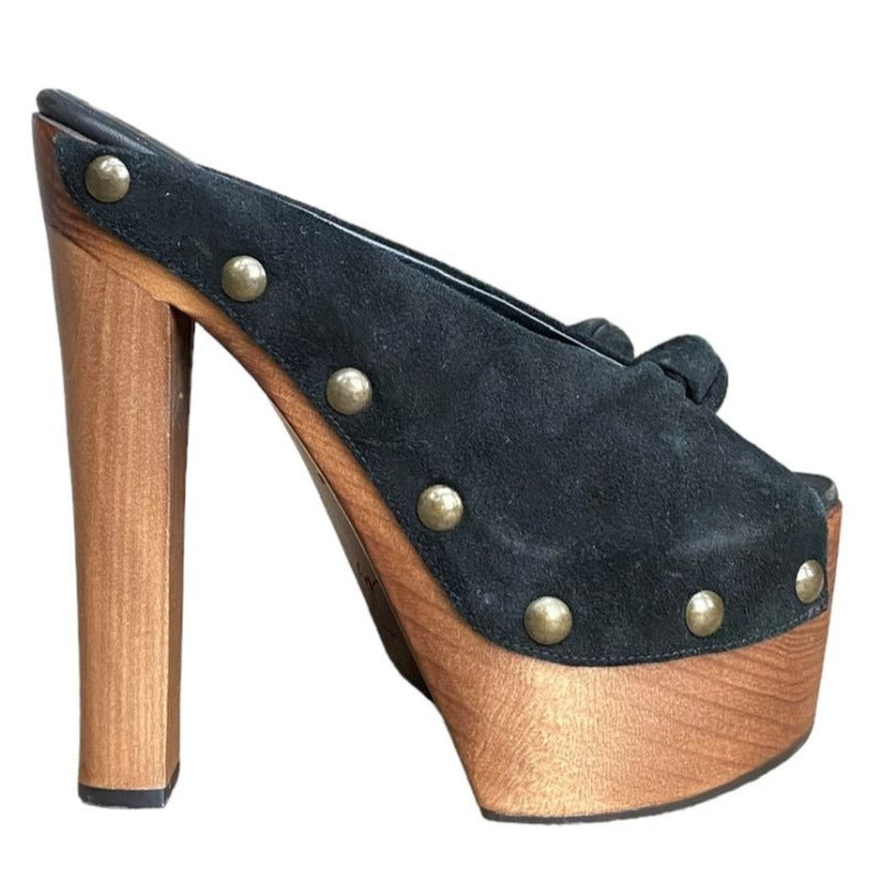GIUSEPPE ZANOTTI Black Suede Knot Studded Wooden Heels Platform Clogs, Size 38