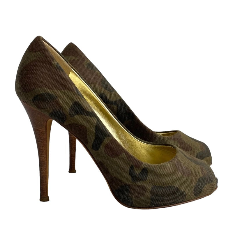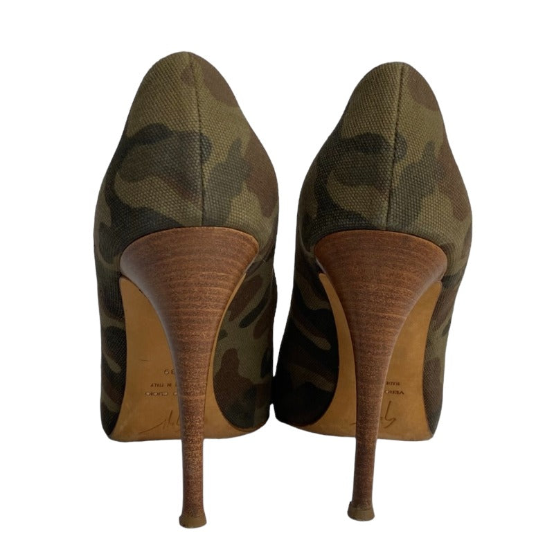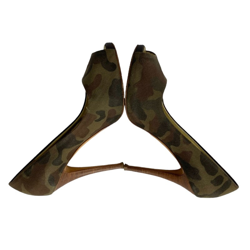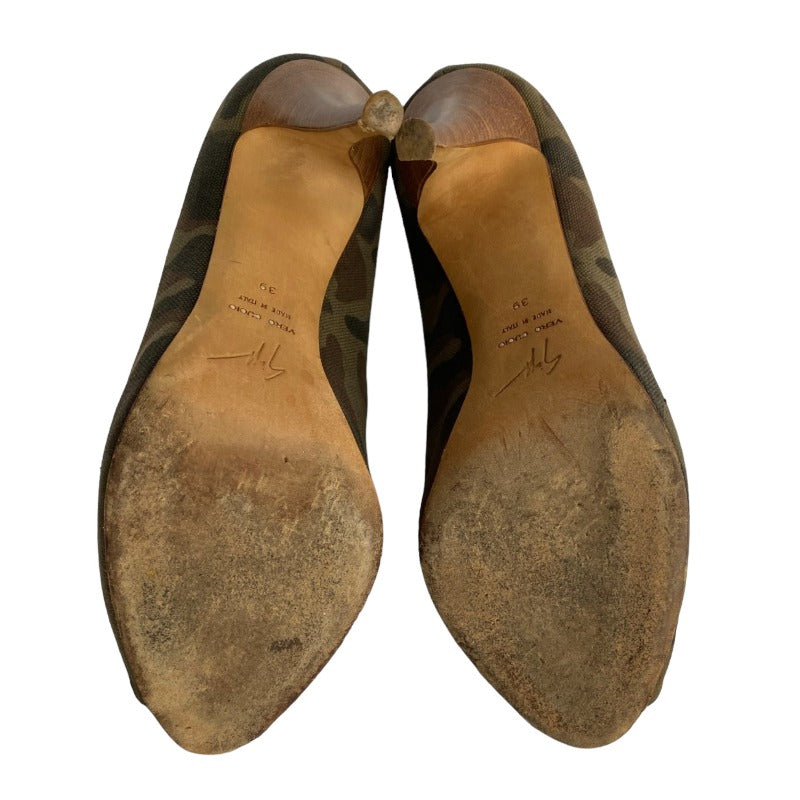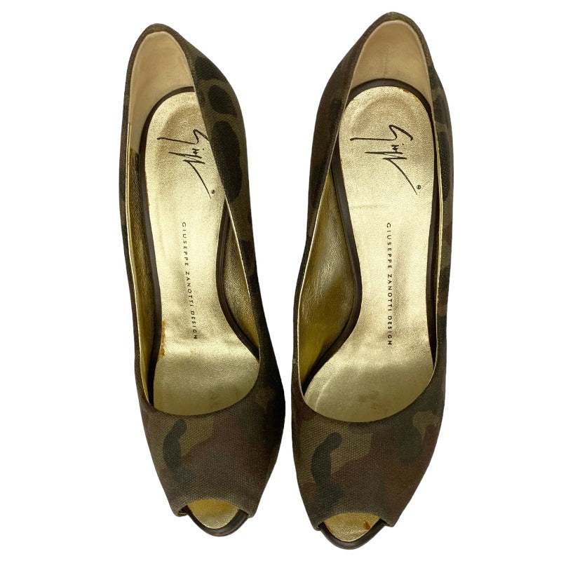 GIUSEPPE ZANOTTI Camouflage Green Brown Fabric Peep Toe Wooden Heels, Size 39