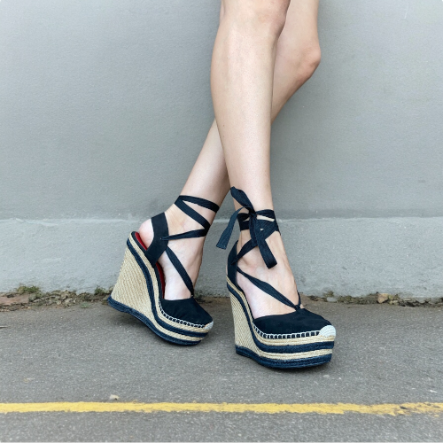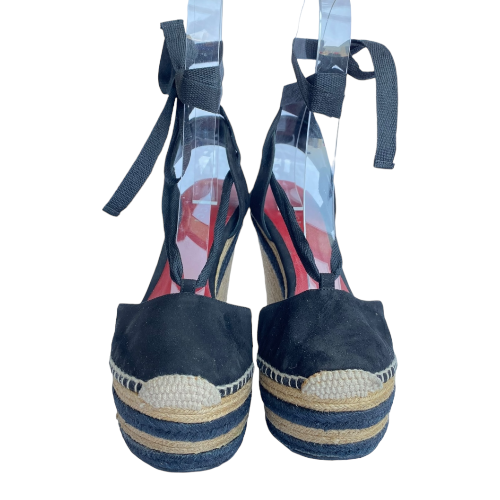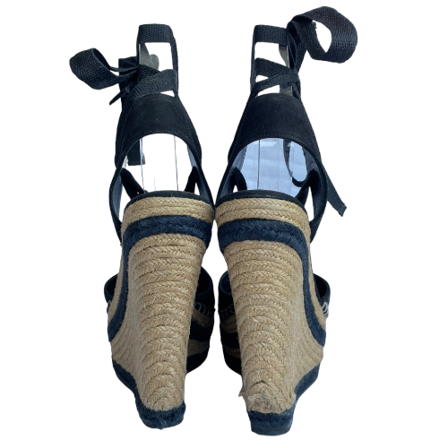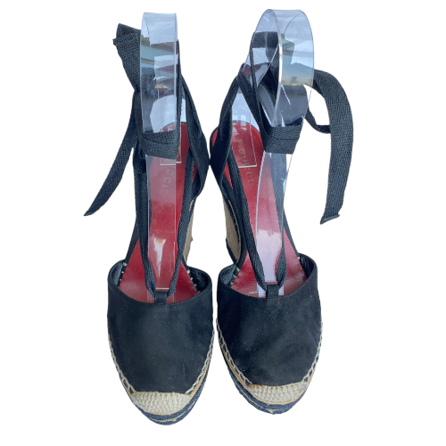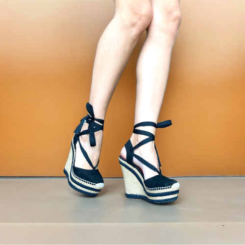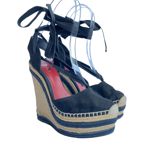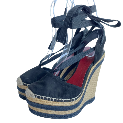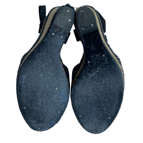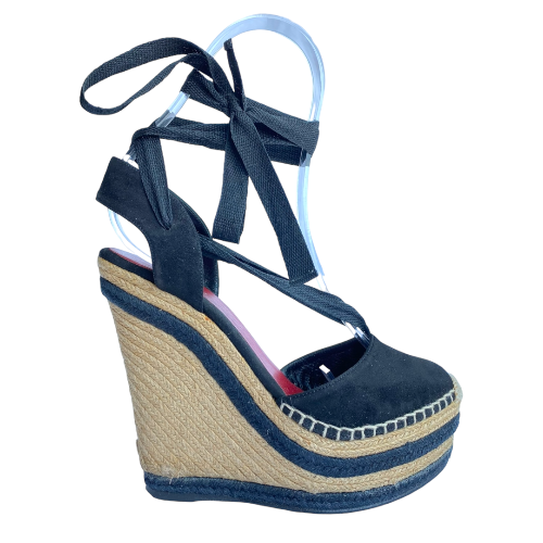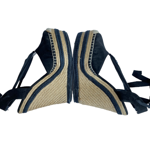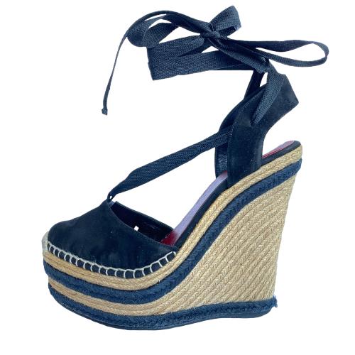 GUCCI Alexis Black Suede Ankle Wrap Platform Espadrille Wedge Sandals, Size 37