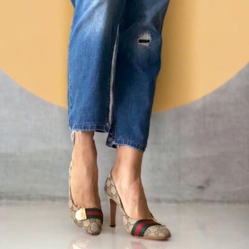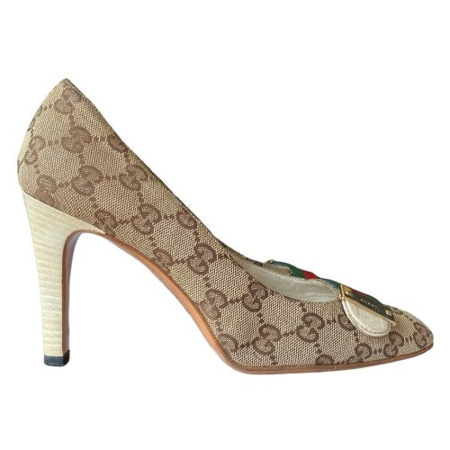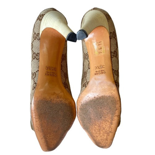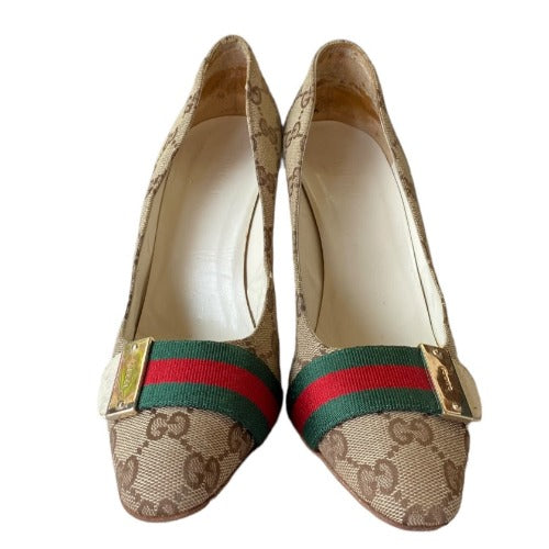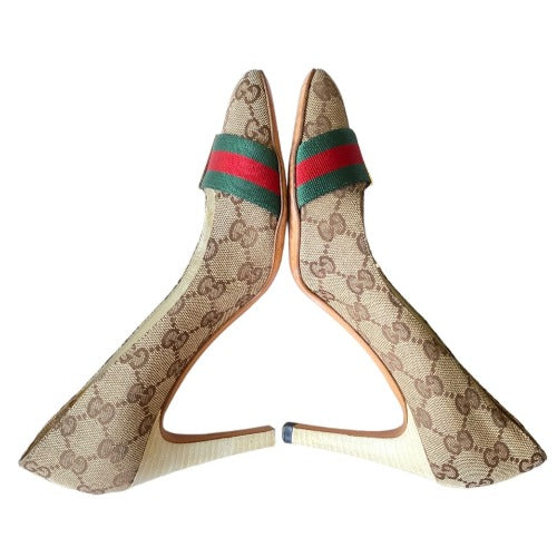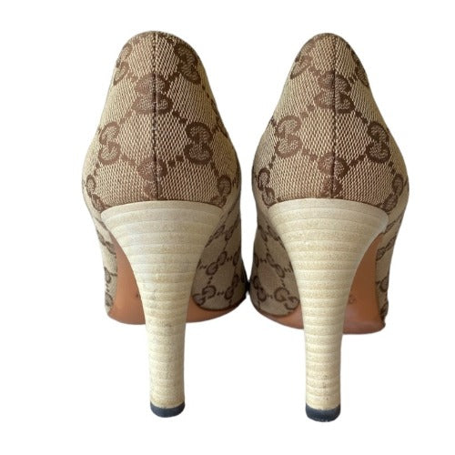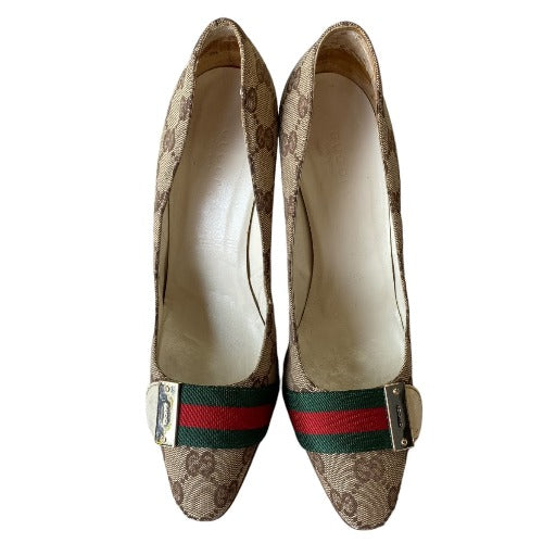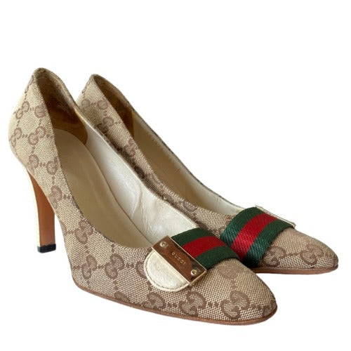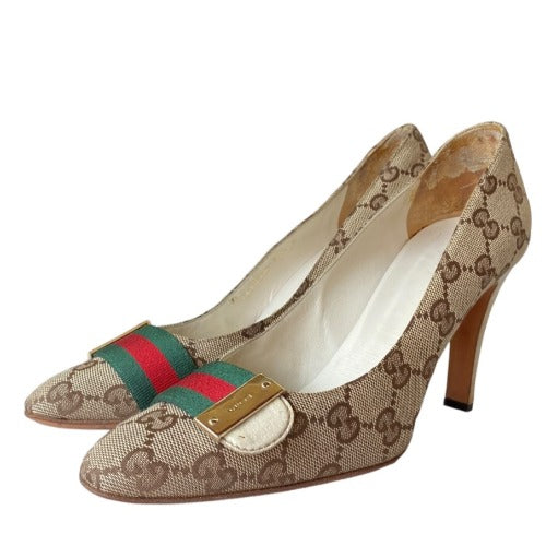 GUCCI Beige Canvas GG Monogram Web Detail Almond Toe Heels, Size 36.5