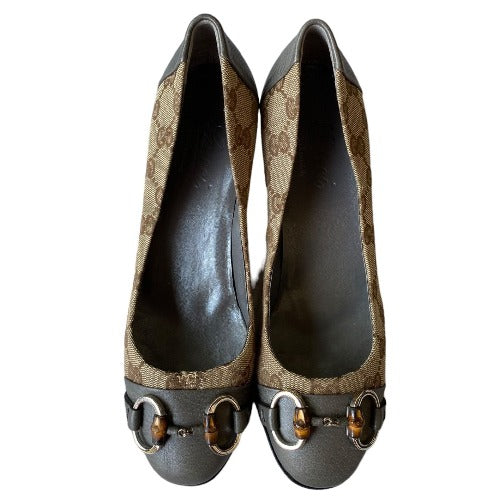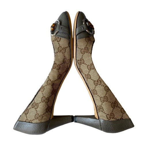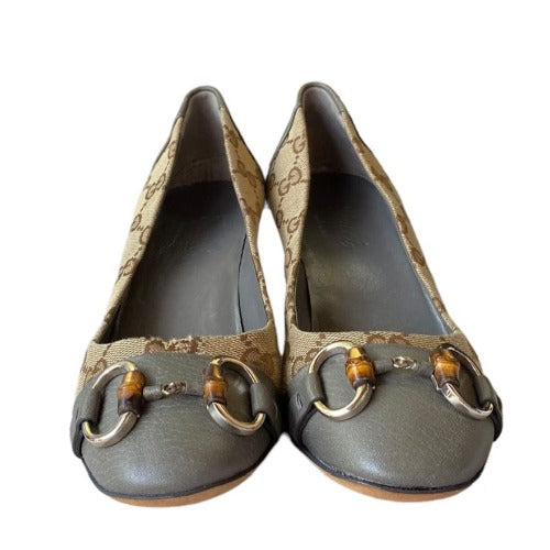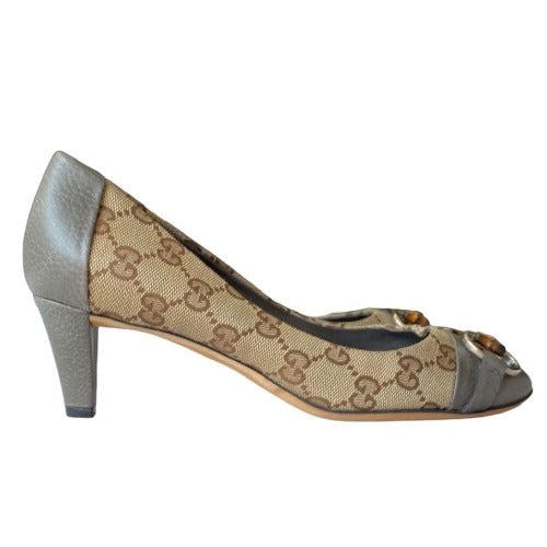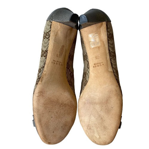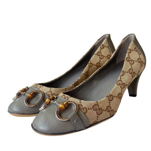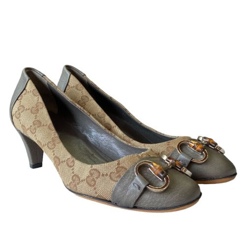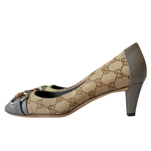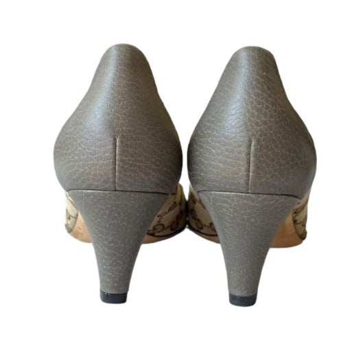NEW GUCCI Beige GG Logo Canvas Grey Leather Cap Toe&Heels Kitten Heel Pumps, Size 36