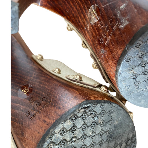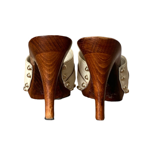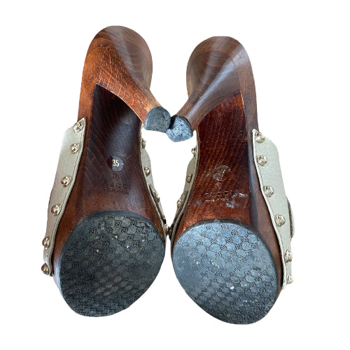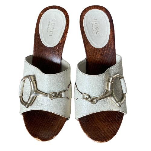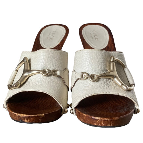 GUCCI Beige Leather Horsebit Icon Bit Wood Clogs, Size 35