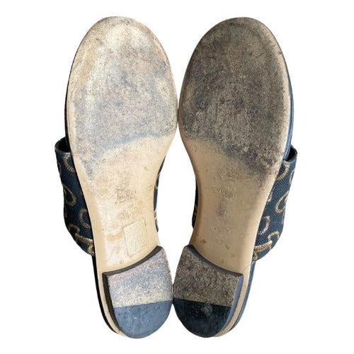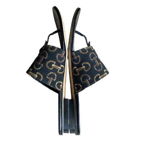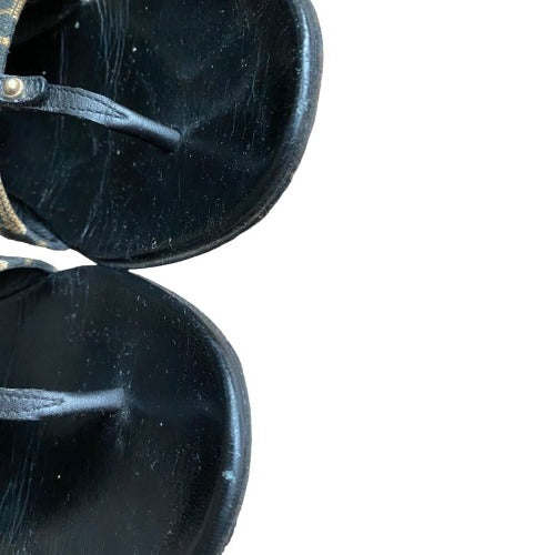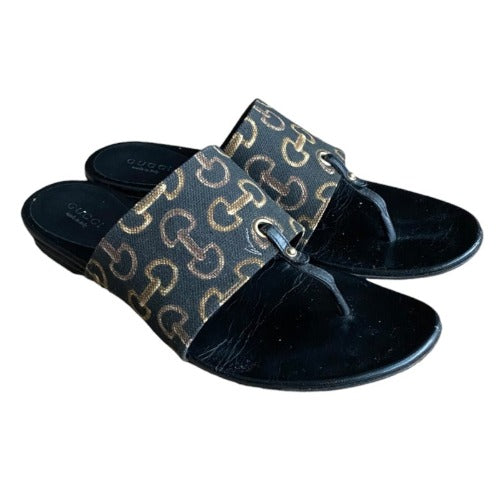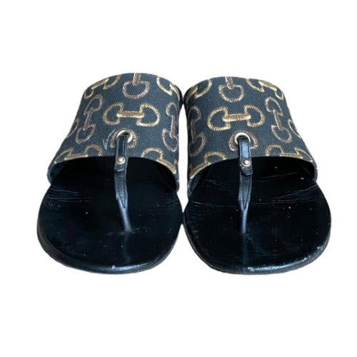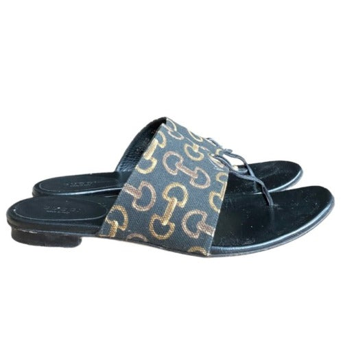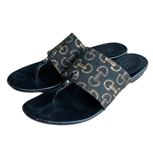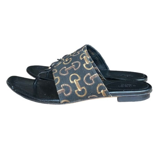 GUCCI Black Brown Horsebit Pattern Canvas Leather Flat Thong Sandals, Size 38.5