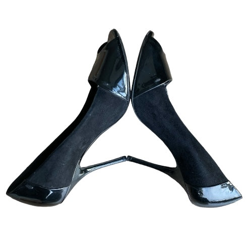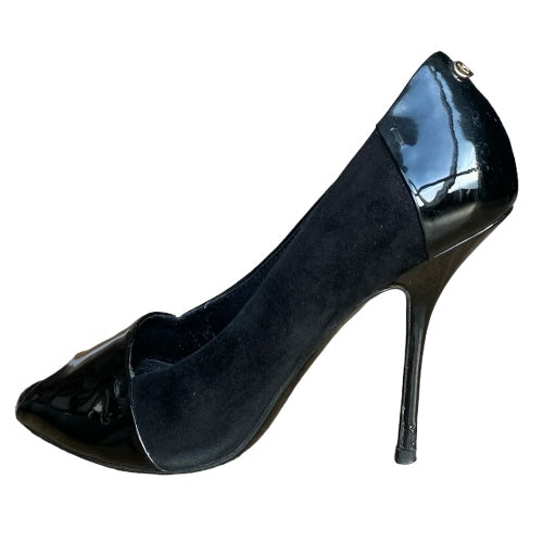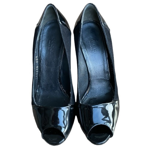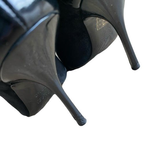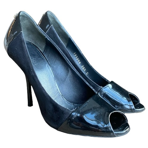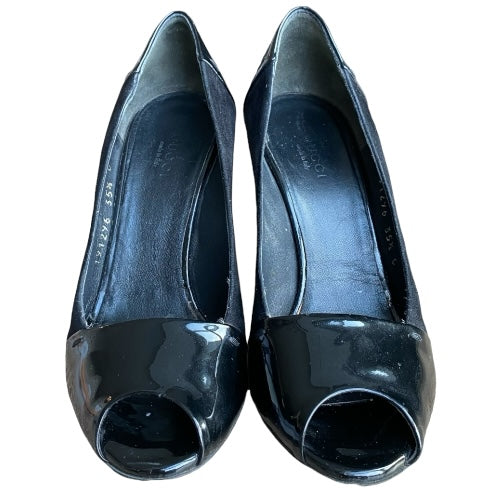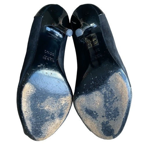 GUCCI Black Suede & Patent Leather GG Logo Detail Peep Toe Pumps, Size 35.5 C