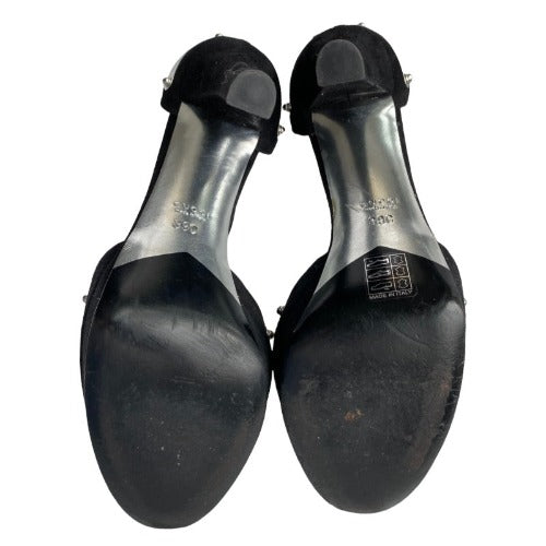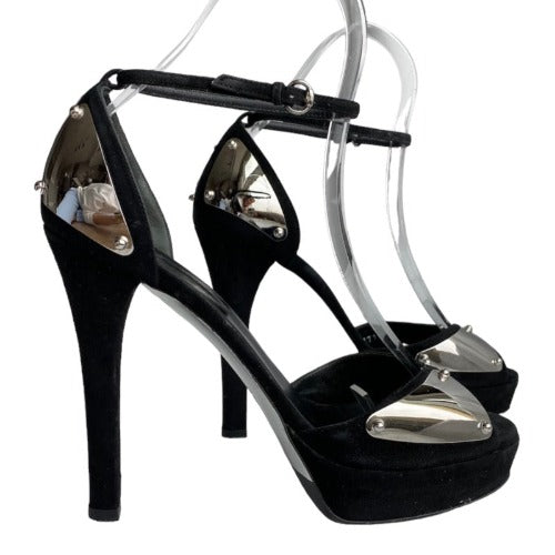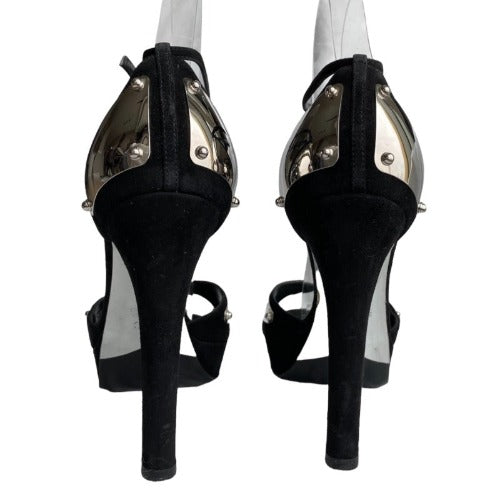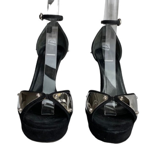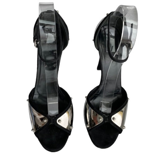 GUCCI Black Suede Silver Mirror Metal Embossed Ankle Strap Heeled Sandals, Size39