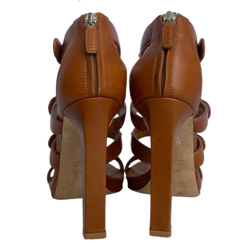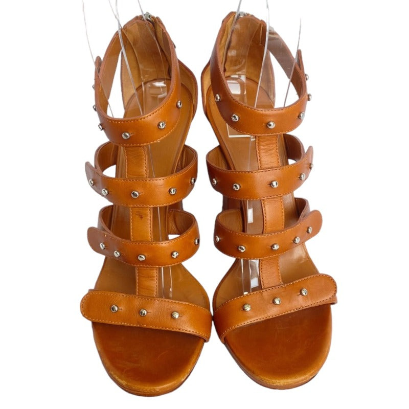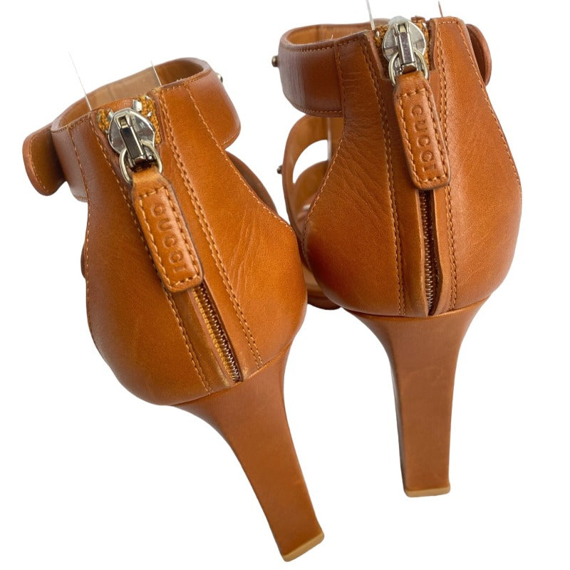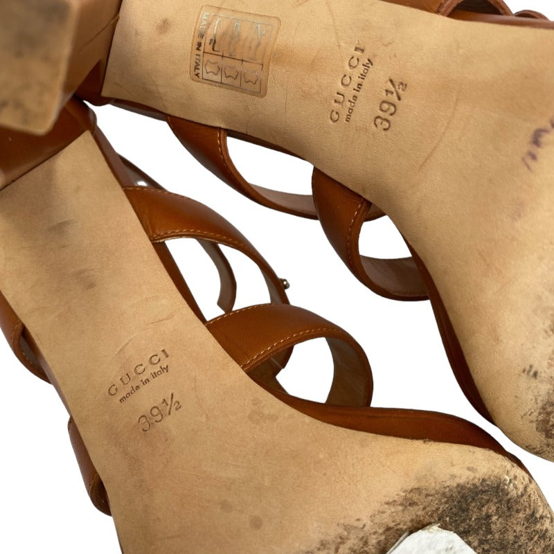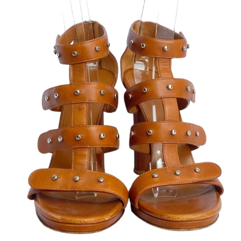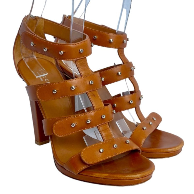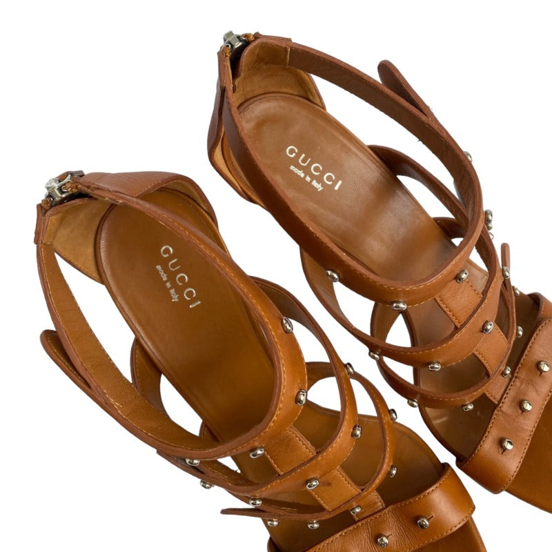 GUCCI Brown Leather, Studded, Strappy Gladiator Heeled Sandals, Size 39.5