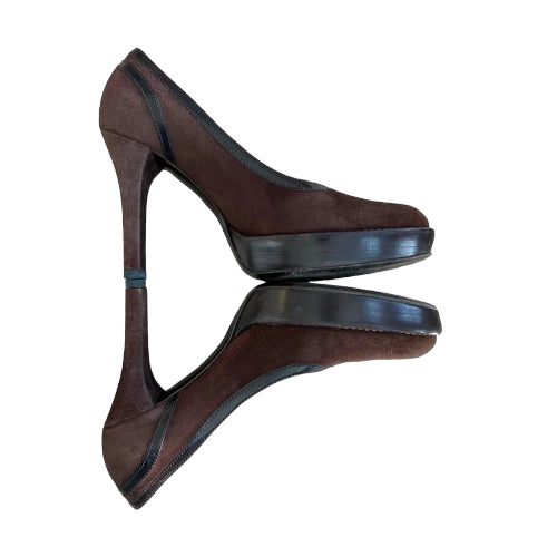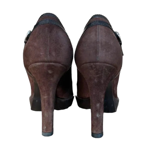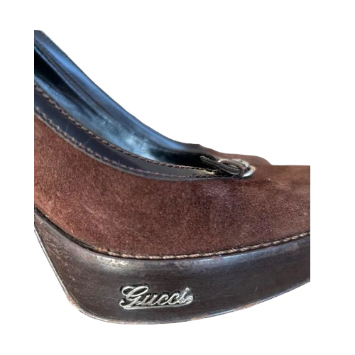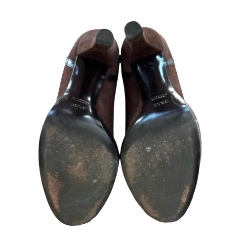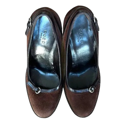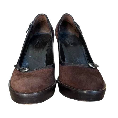 GUCCI Brown Suede And Leather Trim Buckle Detail Round Toe Pumps, Size 35.5