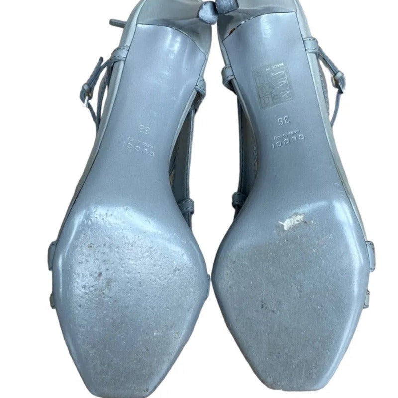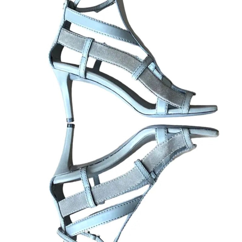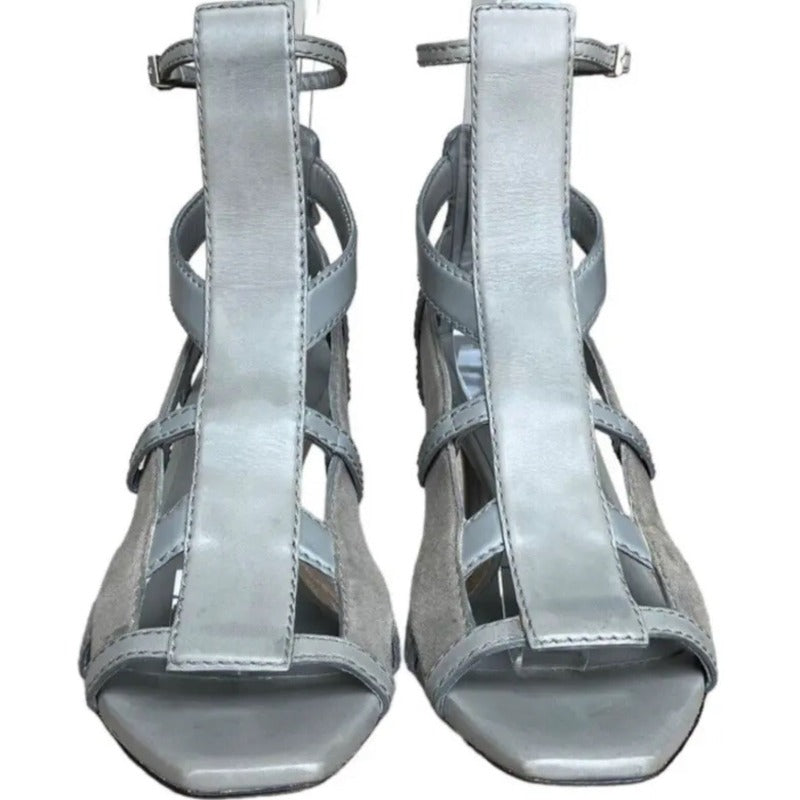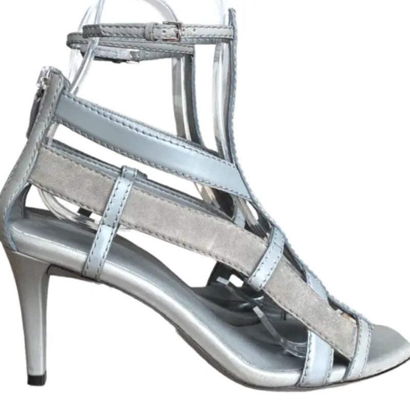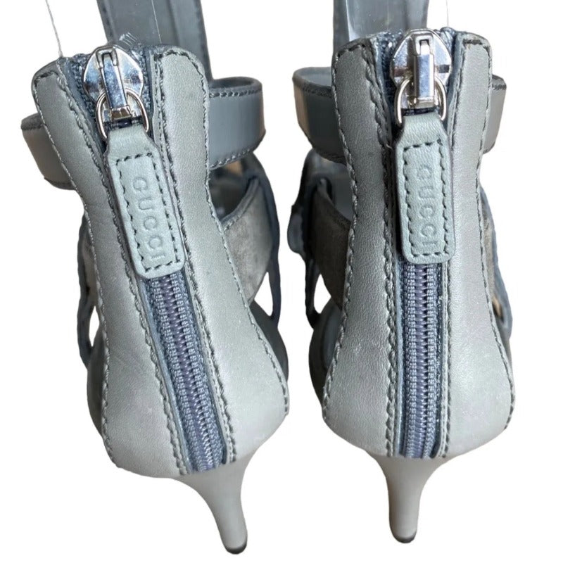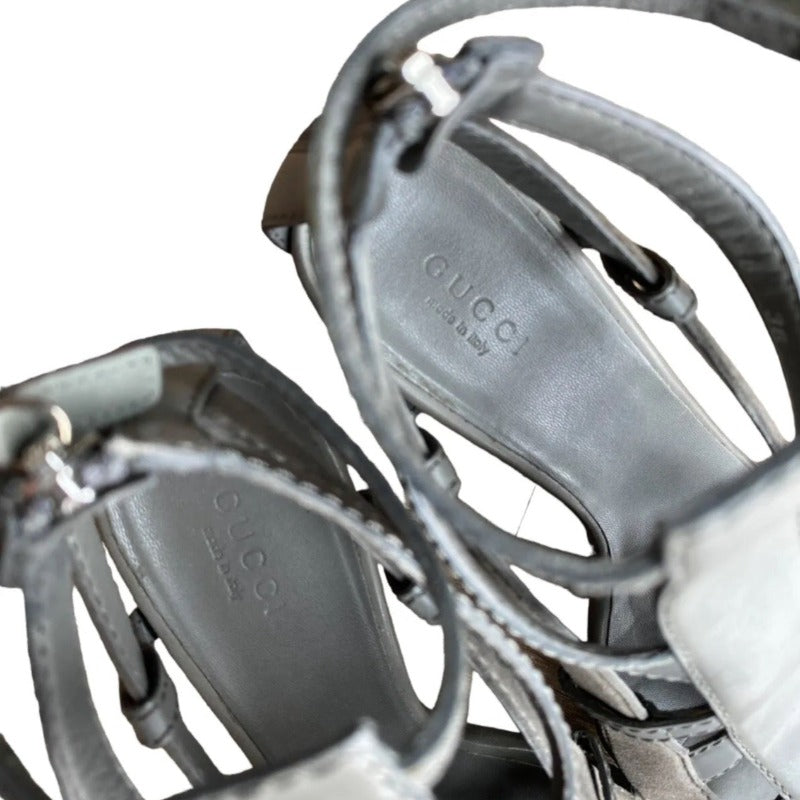 GUCCI Daryl Grey Leather Gladiator Cage Ankle Strap Mid Heel Sandals, Size 36