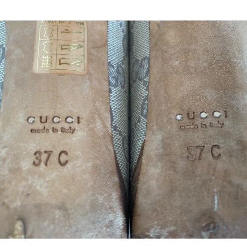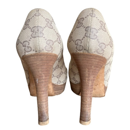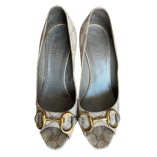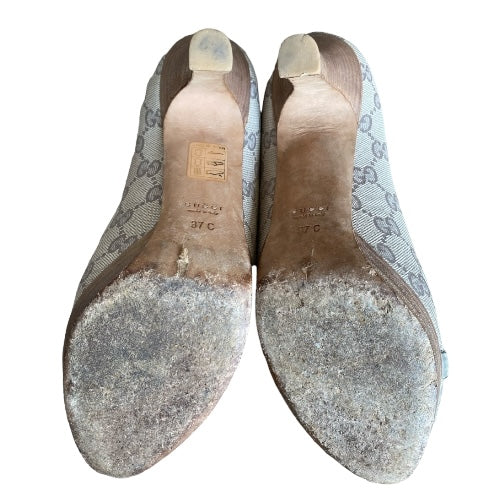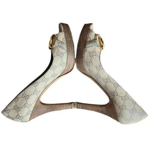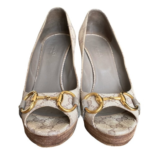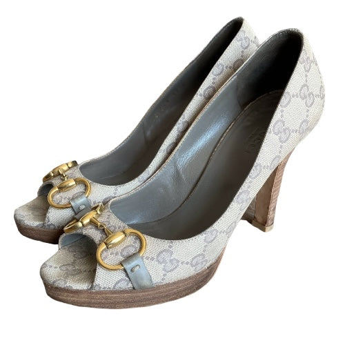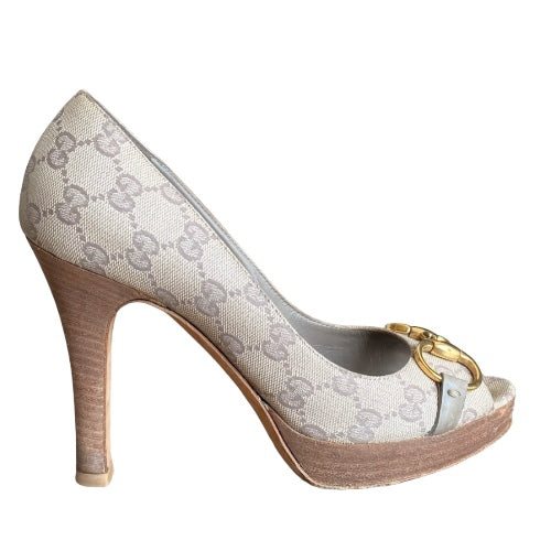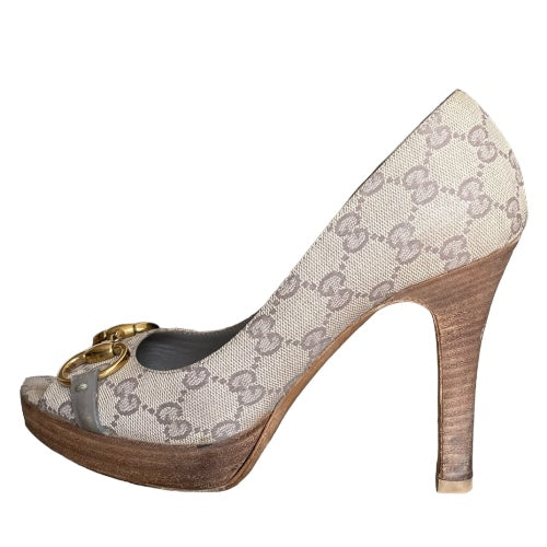GUCCI Guccissima Greige GG Logo Leather Horsebit Platform Peep Toe Pumps, Size 37