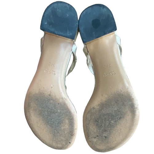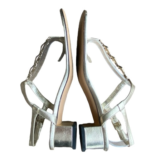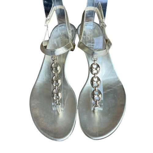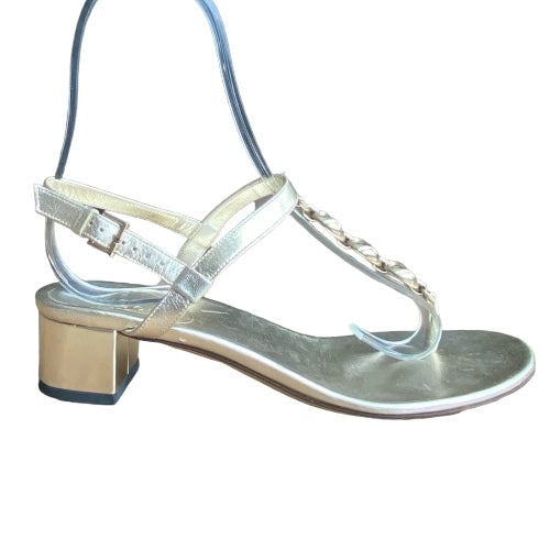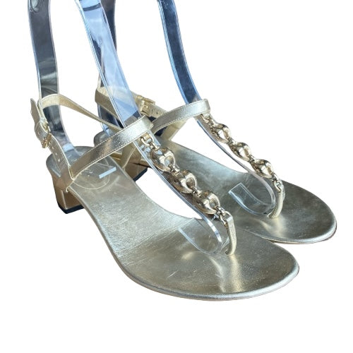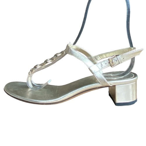GUCCI Metallic Gold Leather Marina Chain T Strap Block Heel Sandals, Size 36