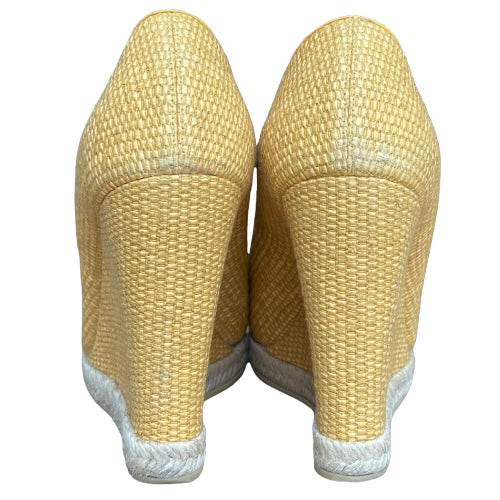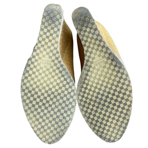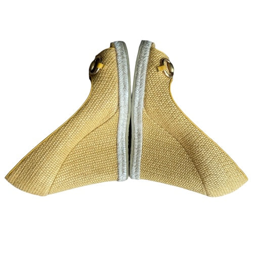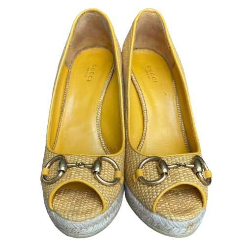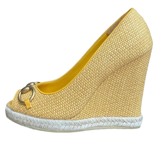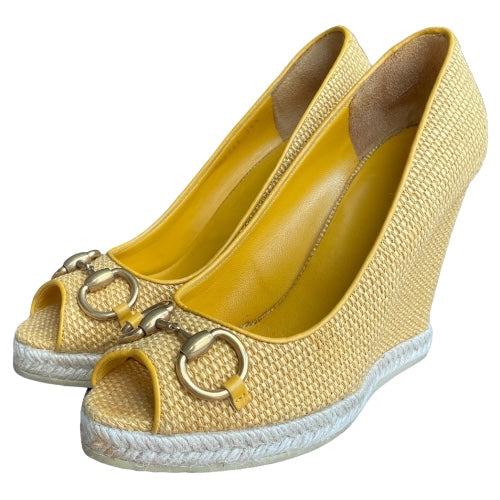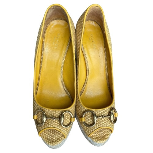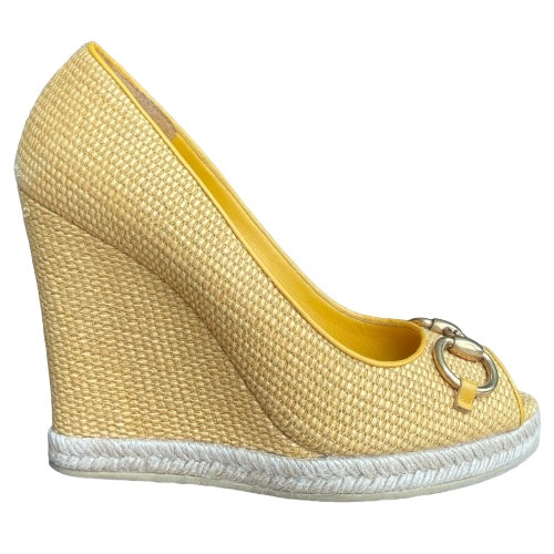 GUCCI Mustard Raffia Charlotte Horsebit Peep Toe Wedge Pumps, Size 38.5