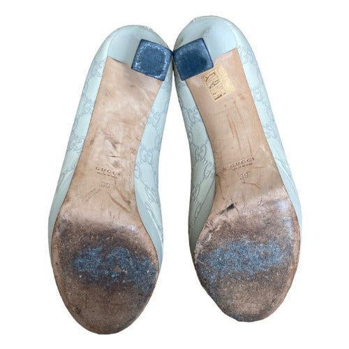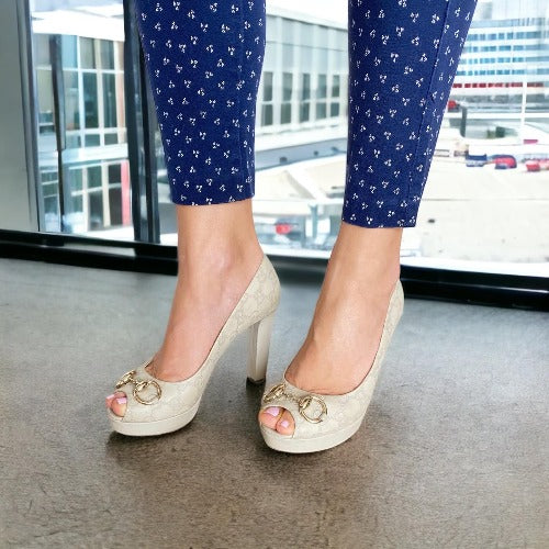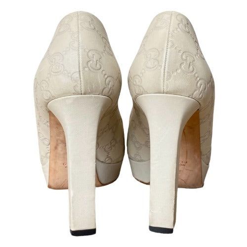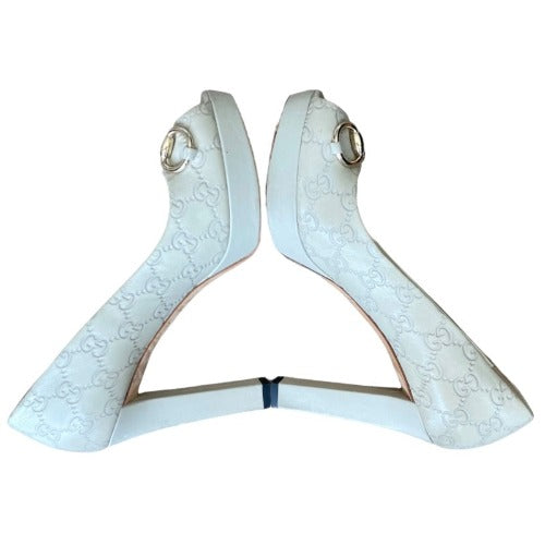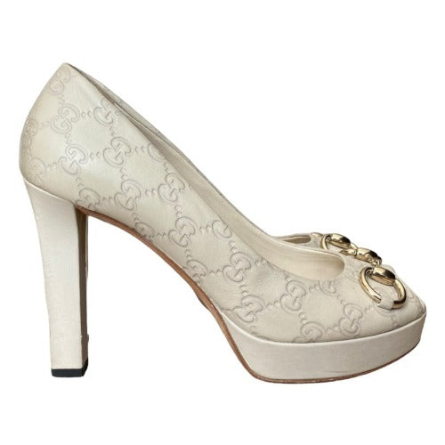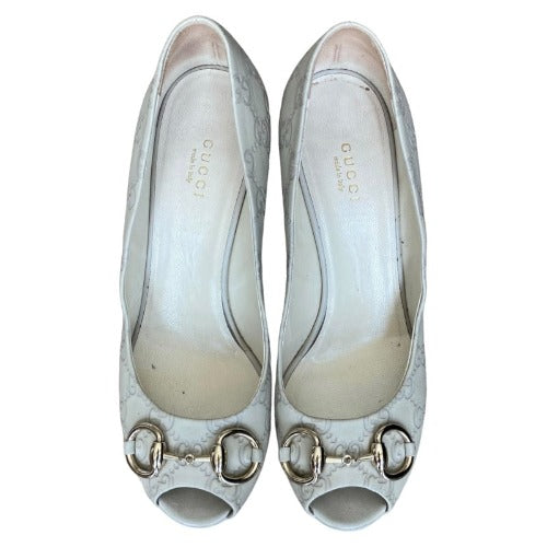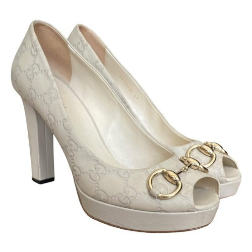 GUCCI Off White Guccissima Leather Horsebit Peep Toe Platform Pumps, Size 39