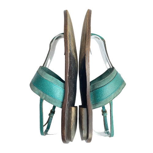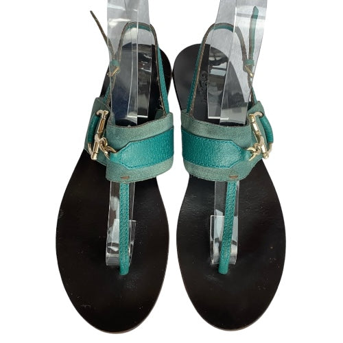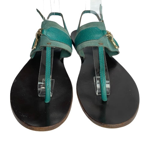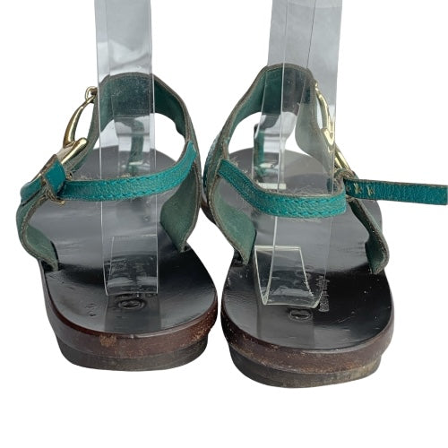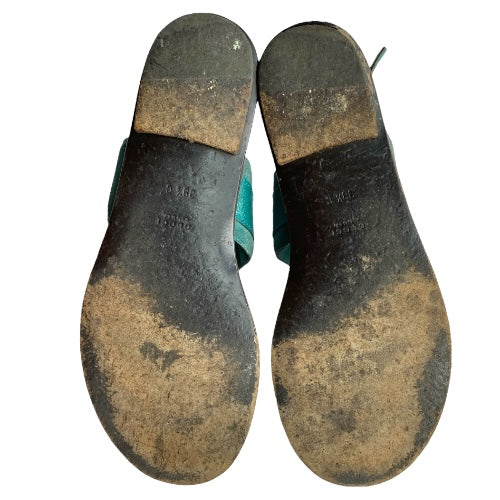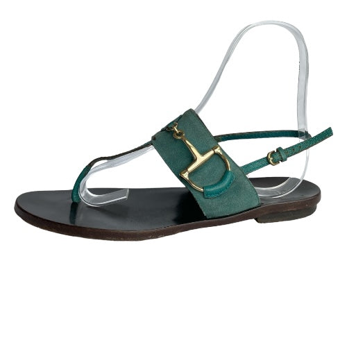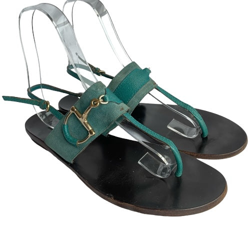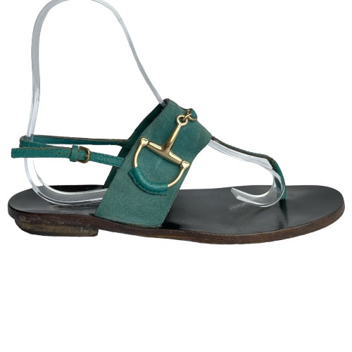 GUCCI Teal Green Nubuck & Leather Horsebit Buckle Flat Thong Sandals, Size 38.5