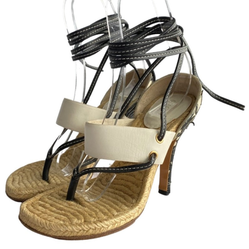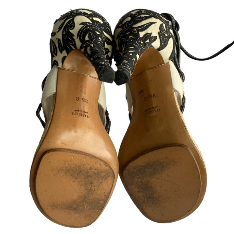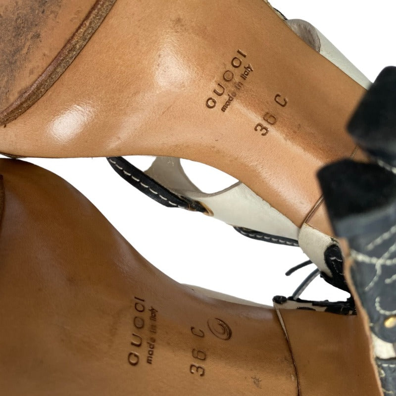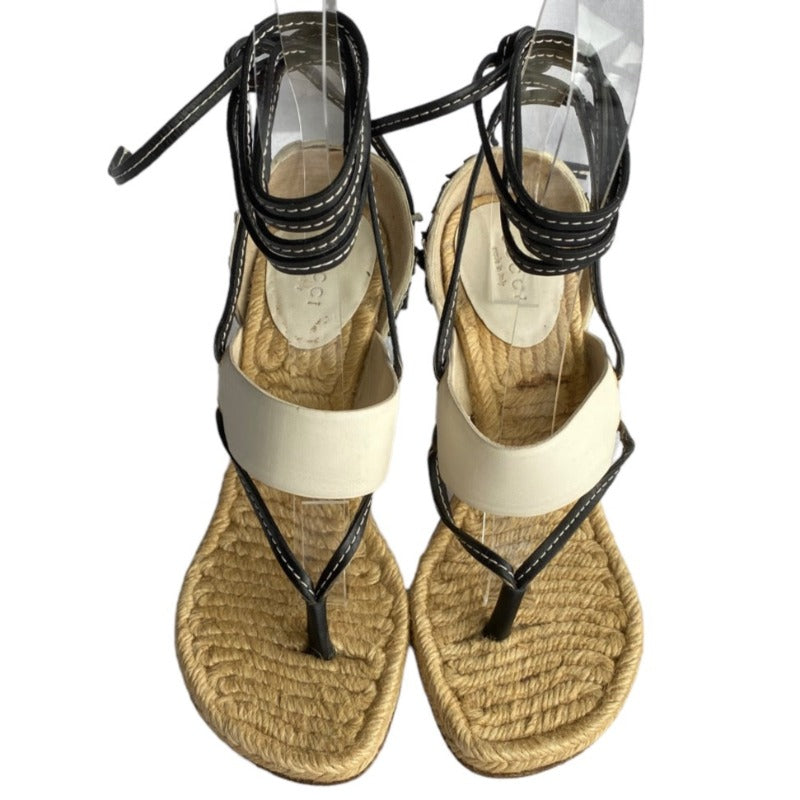 GUCCI White/Black Leather Floral Applique Thong Ankle Wrap Sandals, Size 36