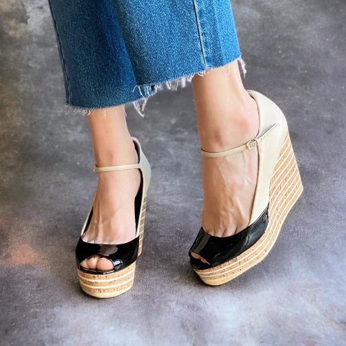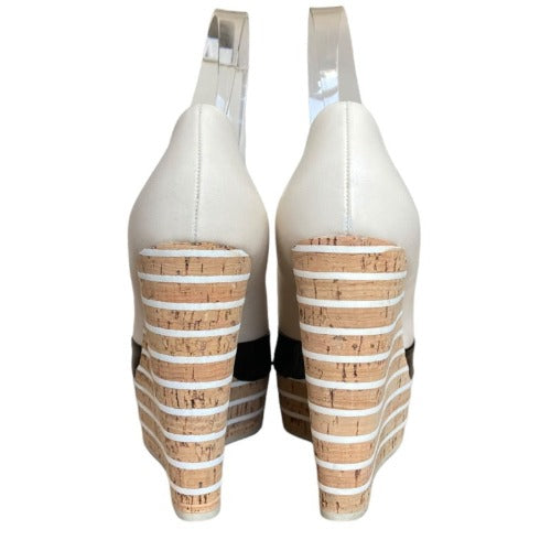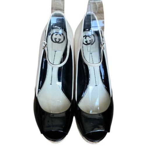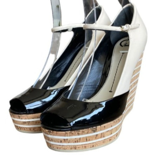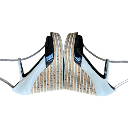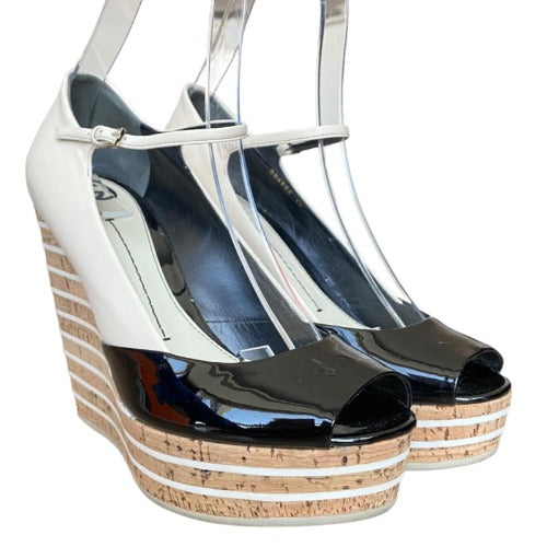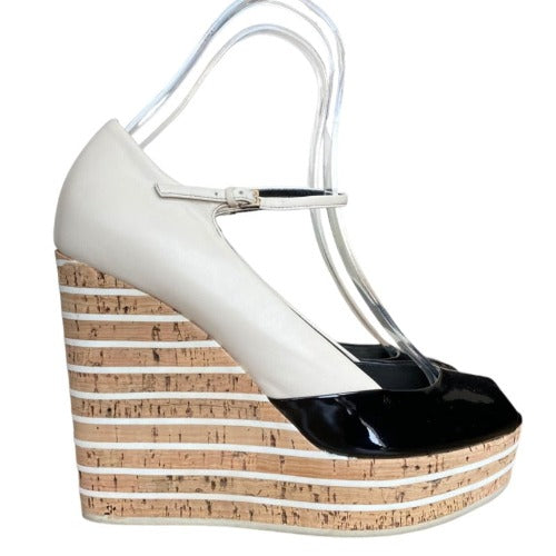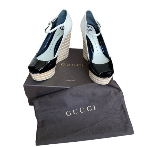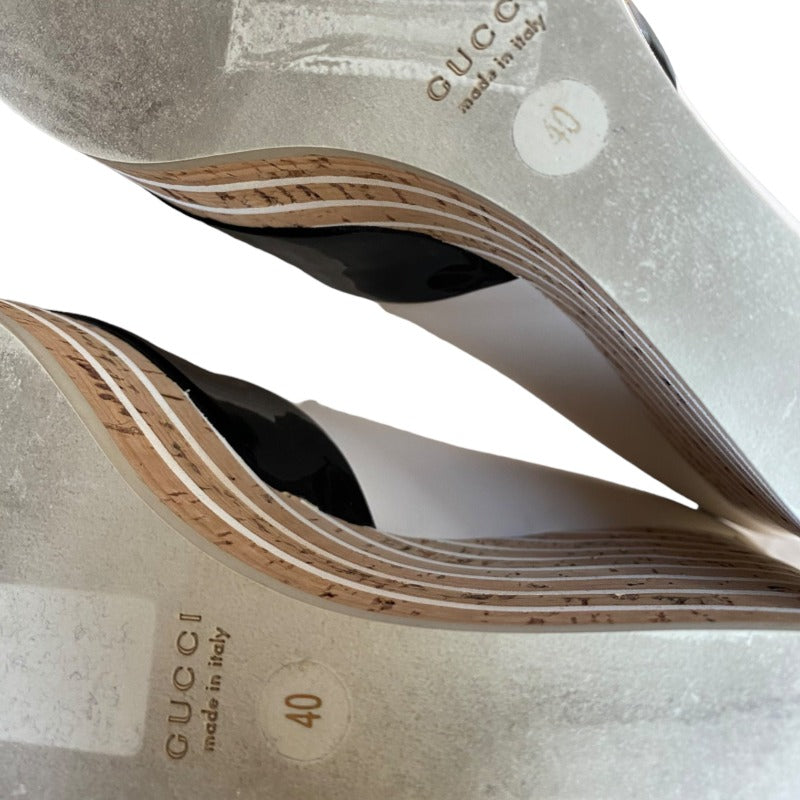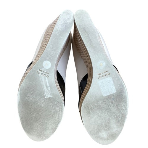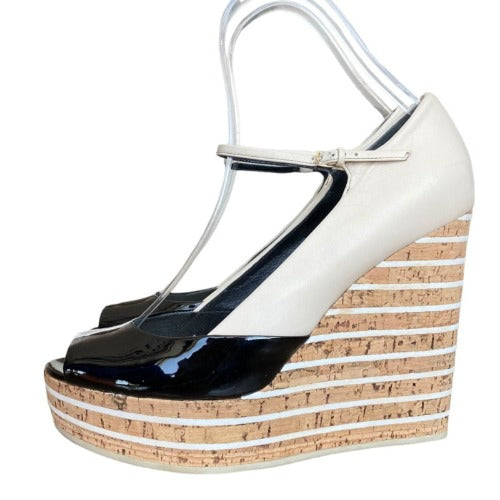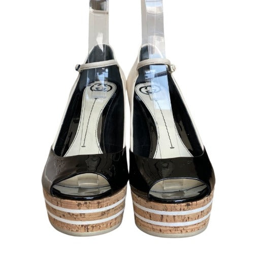 GUCCI White , Black Patent Leather Cork Mary Jane Wedge Cork Sandals, Size 40