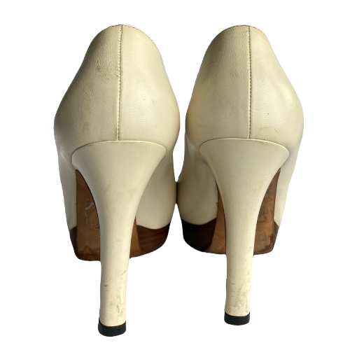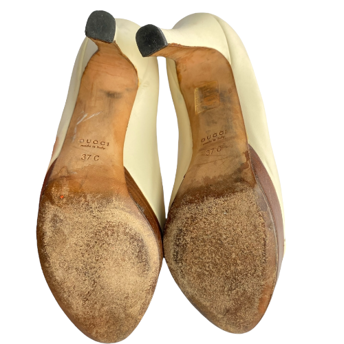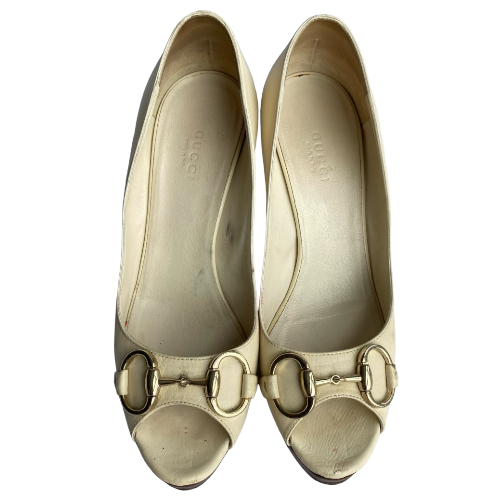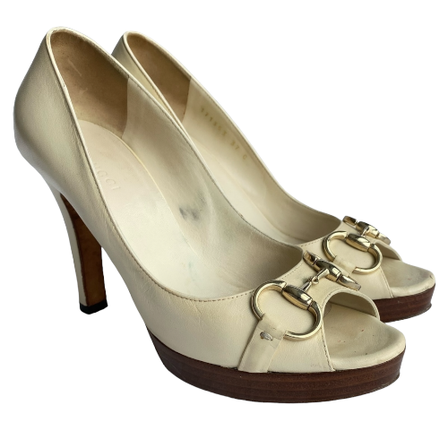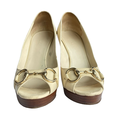 GUCCI White Leather Horsebit Wooden Platform Peep Toe Pumps, Size 37 C