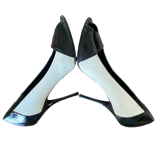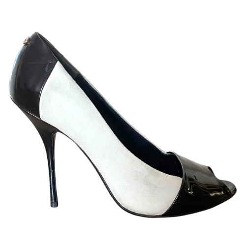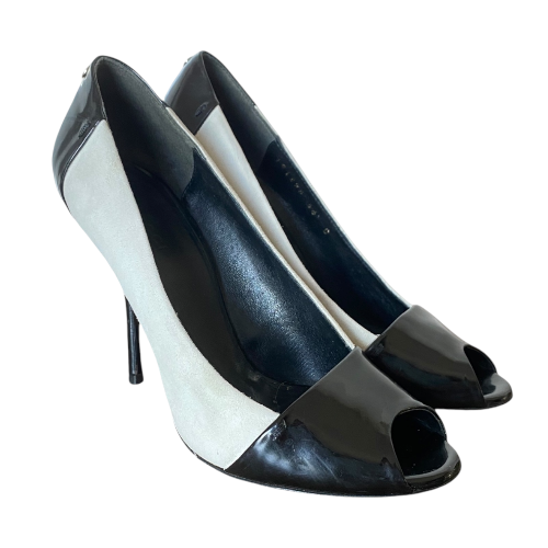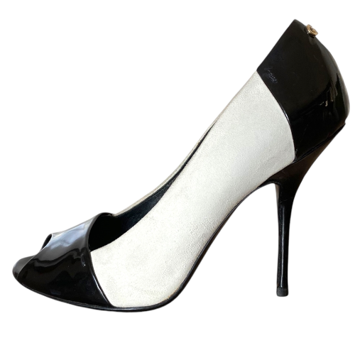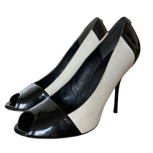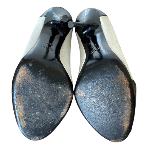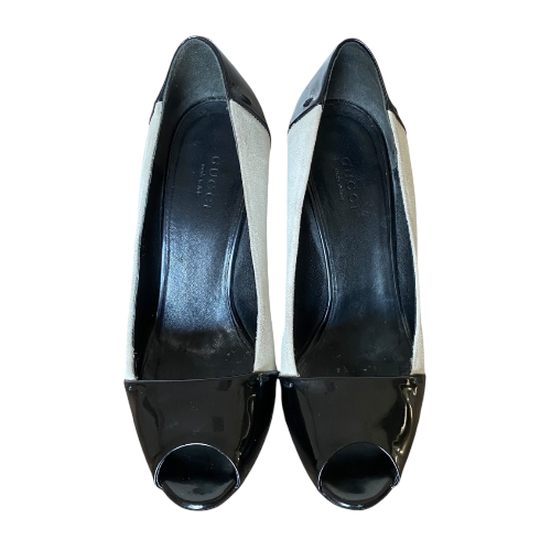 GUCCI White Nubuck Black Patent Peep Toe Pumps, Size 36C
