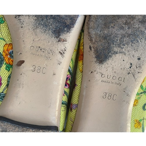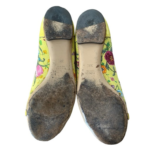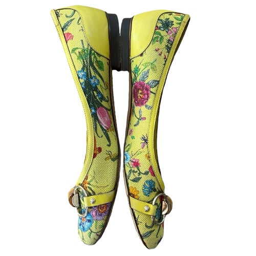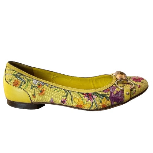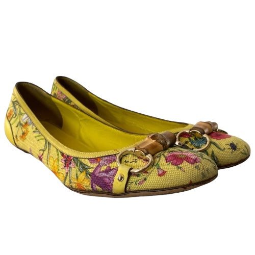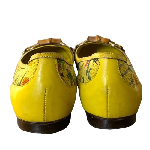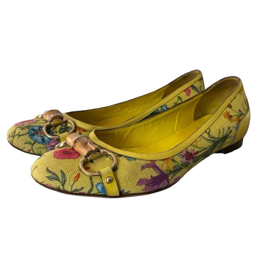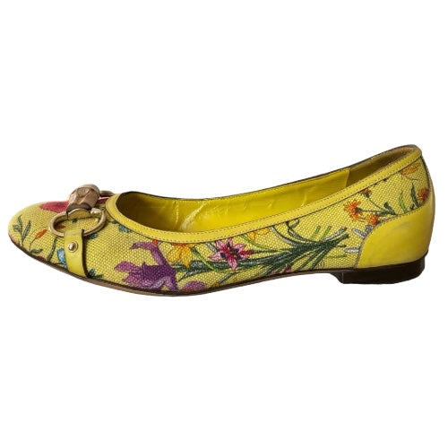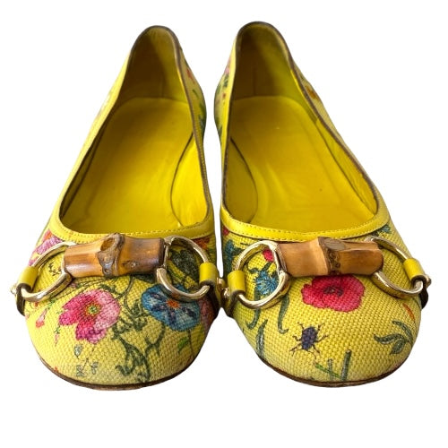 GUCCI Yellow Flora Canvas, Leather Trim, Bamboo Buckle Ballet Flats, Size 38