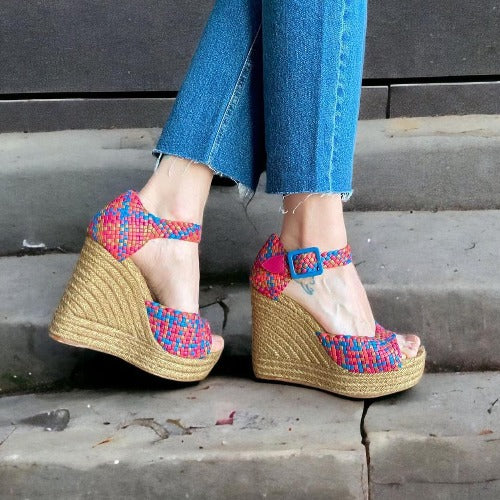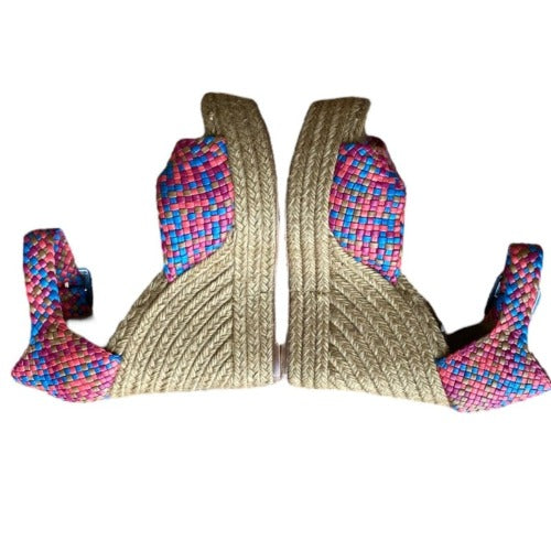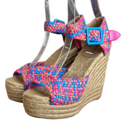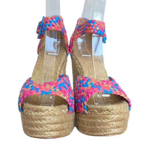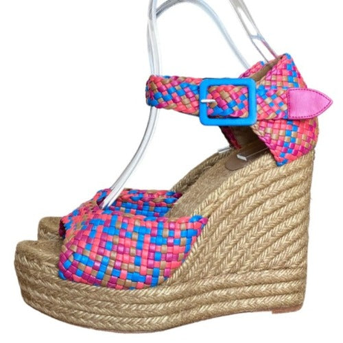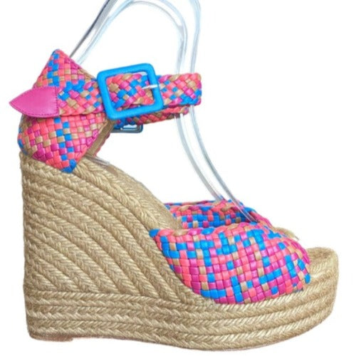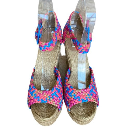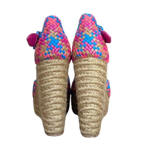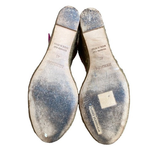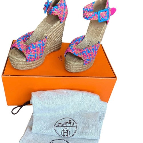 HERMES Multicolor Braided Leather Ankle Strap Espadrille Wedges Sandals, Size 40