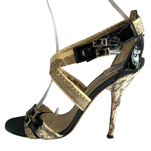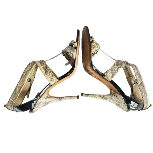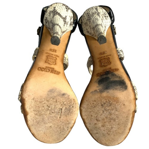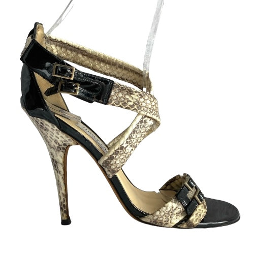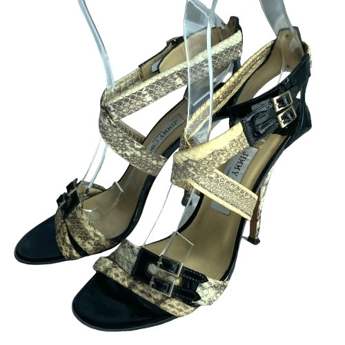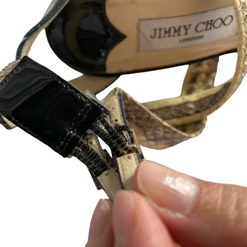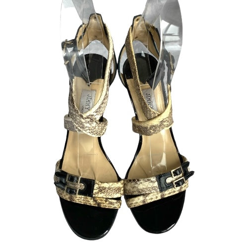 JIMMY CHOO Aby Snakeskin & Black Patent Leather Crisscross Sandals, Size 37.5
