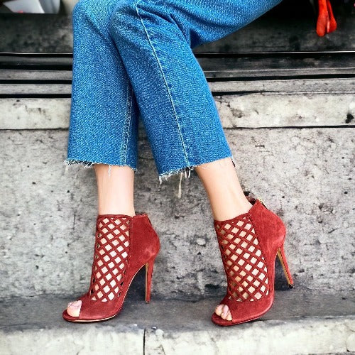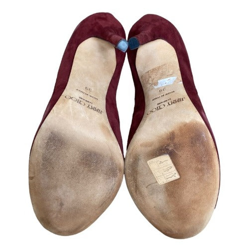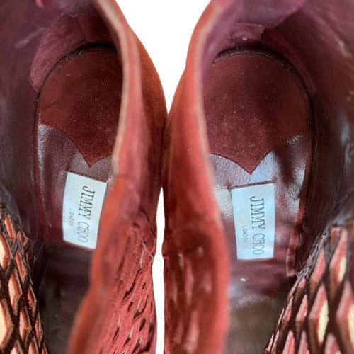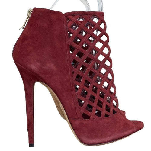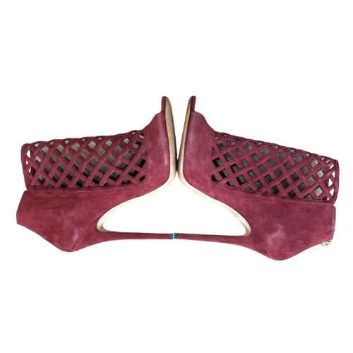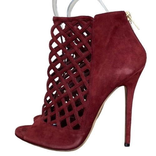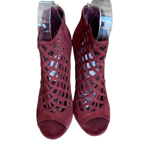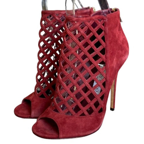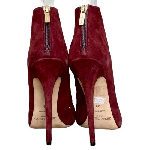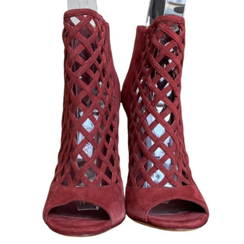 JIMMY CHOO Burgundy Suede Drift Cutout Peep-Toe Booties, Size 39